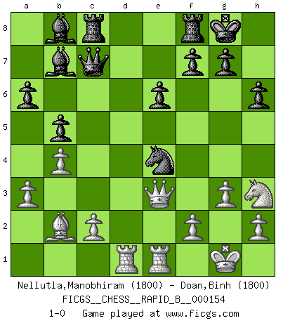 Last move : 1-0 2010 July 18 2:33:30 [Event "FICGS__CHESS__RAPID_B__000154"] [Site "FICGS"] [Date "2010.06.30"] [Round "1"] [White "Nellutla,Manobhiram"] [Black "Doan,Binh"] [Result "1-0"] [WhiteElo "1800"] [BlackElo "1800"] 1.d4 Nf6 2.e3 e6 3.Nc3 c5 4.dxc5 Bxc5 5.Nf3 a6 6.Bd3 O-O 7.O-O d5 8.Re1 Nc6 9.a3 b5 10.b4 Bd6 11.Bb2 Bb7 12.Rb1 Rc8 13.Ng5 h6 14.Nh3 Ne5 15.e4 Nxd3 16.Qxd3 dxe4 17.Nxe4 Nxe4 18.Rbd1 Bb8 19.Qe3 Qc7 20.g3 1-0 Queen's pawn game Kingside Castling by player Black (move 6) Kingside Castling by player White (move 7) Player White won this chess game. Follow this game move after move (download)When asked, -How is that you pick better moves than your opponents?, I responded: I'm very glad you asked me that, because, as it happens, there is a very simple answer. I think up my own moves, and I make my opponent think up his. (Alexander Alekhine) Es ist schade, dass viele Schachsportler vergessen, wie wichtig Auftreten und angemessene Kleidung sind. (Alexandra Kosteniuk) Un mal día en el Ajedrez, es mejor que cualquier buen día en el trabajo. (Anonymous) A ce moment-là, je menaçais de comprendre la position ! (Clément L'Heureux) It's only after you lost everything, Tyler says, that you're free to do anything. (Chuck Palahniuk, Fight Club)