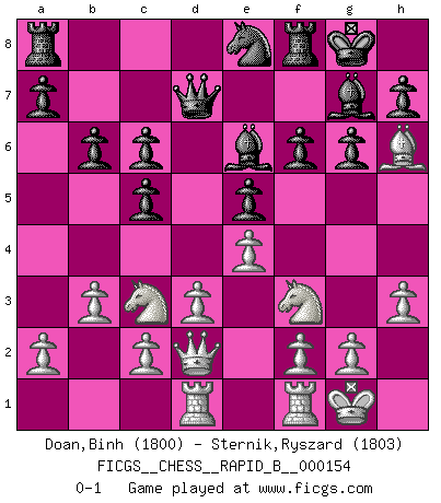 Last move : 0-1 2010 July 18 2:33:58 [Event "FICGS__CHESS__RAPID_B__000154"] [Site "FICGS"] [Date "2010.06.30"] [Round "1"] [White "Doan,Binh"] [Black "Sternik,Ryszard"] [Result "0-1"] [WhiteElo "1800"] [BlackElo "1803"] 1.e4 c5 2.Nf3 Nc6 3.Bb5 g6 4.Bxc6 dxc6 5.d3 Bg7 6.O-O Nf6 7.h3 O-O 8.Nc3 Ne8 9.Be3 b6 10.Qd2 e5 11.Rad1 f6 12.b3 Be6 13.Bh6 Qd7 0-1 Sicilian : Nimzovich-Rossolimo attack (with ...g6, without ...d6) Kingside Castling by player White (move 6) Kingside Castling by player Black (move 7) Player Black won this chess game. Follow this game move after move (download)Weak points or holes in the opponent's position must be occupied by pieces not Pawns. (Siegbert Tarrasch) Bogoljubow: Matt in vier Zügen! Tartakower: Ich verbitte mir jede Belästigung! (Savielly Grigorievitsch Tartakower) Si pudieramos observar el interior de la cabeza de un jugador de Ajedrez, encontraríamos ahí un mundo lleno de sentimientos, imágenes, ideas, emoción y pasión. (Alfred Binet) Ne tendez aucun piège pour le plaisir ! Ne jouez rien dans l'espoir que l'adversaire réagisse de façon stupide ! Prenez toujours pour acquis que l'adversaire va trouver le meilleur coup ! Ne jouez jamais de coup dans l'espoir que l'adversaire ne voie pas la menace ! Chacun de vos coups doit améliorer la position d'une façon ou d'une autre. All maxims have their antagonist maxims; proverbs should be sold in pairs, a single one being but a half truth. (William Mathews)