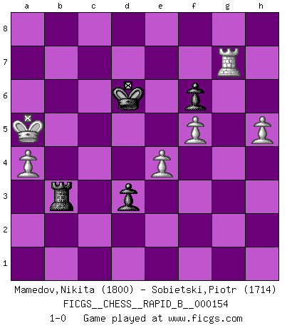 Last move : 1-0 2010 December 16 22:35:49 [Event "FICGS__CHESS__RAPID_B__000154"] [Site "FICGS"] [Date "2010.06.30"] [Round "1"] [White "Mamedov,Nikita"] [Black "Sobietski,Piotr"] [Result "1-0"] [WhiteElo "1800"] [BlackElo "1714"] 1.d4 d5 2.c4 dxc4 3.e3 Nf6 4.Bxc4 e6 5.Nc3 c5 6.Nf3 a6 7.a4 Nc6 8.O-O Be7 9.dxc5 Qxd1 10.Rxd1 Bxc5 11.b3 b6 12.Ng5 Bb4 13.Nge4 Nxe4 14.Nxe4 Ke7 15.Bb2 f6 16.Rac1 Bb7 17.f3 Rac8 18.Be2 Na5 19.Rd4 Rxc1+ 20.Bxc1 Nc6 21.Rc4 Rd8 22.Nf2 Rd7 23.Nd3 Bd6 24.Bd2 Rd8 25.f4 Nb8 26.Kf2 Bd5 27.Rc3 Nc6 28.Bf3 Bxf3 29.Kxf3 Rc8 30.g4 e5 31.f5 Kd7 32.Nf2 Rh8 33.Ne4 Be7 34.h4 h5 35.gxh5 Rxh5 36.Kg4 Rh8 37.h5 Nb4 38.Rc4 Nd5 39.Nc3 Nxc3 40.Rxc3 a5 41.e4 Bc5 42.Rd3+ Ke7 43.Bc3 Rc8 44.Rd1 Be3 45.Rd3 Bf2 46.Kf3 Bc5 47.Ke2 Rh8 48.Rh3 Kd7 49.Kd3 Ke7 50.Kc4 Rc8 51.Kb5 Bd4 52.Bxd4 exd4 53.Rg3 Kf7 54.Rg2 Rc3 55.Kxb6 Rxb3+ 56.Kxa5 d3 57.Rd2 Ke7 58.Rg2 Kd6 59.Rxg7 1-0 This chess game has been lost on time (started : 2010.06.30 0:25:26) Queen's gambit accepted Kingside Castling by player White (move 8) 10 pieces endgame at move 59 : White KRPPPP , Black KRPP WHITE : King + 1 Rook 4 Pawns BLACK : King + 1 Rook 2 Pawns Player White won this chess game. Follow this game move after move (download)Modern Chess is too much concerned with things like Pawn structure. Forget it, Checkmate ends the game. (Nigel Short) Man gibt nur Pakete auf. (Paul Keres) Durante una competencia de Ajedrez, un Maestro de Ajedrez deberá ser una combinación de presa de caza y un Monge. (Alexander Alekhine) Les Echecs, c'est l'art de la guerre sans les charniers, c'est la résurrection des morts tombés au champ d'honneur, l'espoir perpétuel, la suprématie de l'intelligence sur la force, la culture de l'esprit. (F. Szpiner) Lamb in skin of tiger, still fears the wolf. (Chinese proverb)