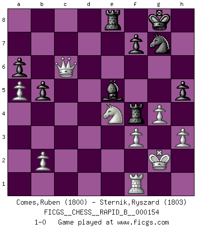 Last move : 1-0 2010 July 19 19:55:39 [Event "FICGS__CHESS__RAPID_B__000154"] [Site "FICGS"] [Date "2010.06.30"] [Round "1"] [White "Comes,Ruben"] [Black "Sternik,Ryszard"] [Result "1-0"] [WhiteElo "1800"] [BlackElo "1803"] 1.e4 e5 2.Nf3 Nc6 3.Bb5 a6 4.Ba4 Nf6 5.O-O Nxe4 6.d4 b5 7.Bb3 d5 8.dxe5 Be6 9.Nbd2 Nc5 10.c3 d4 11.Bxe6 Nxe6 12.cxd4 Ncxd4 13.a4 Bc5 14.Ne4 Bb6 15.Nfg5 Nxg5 16.Bxg5 Qd7 17.Bf6 O-O 18.a5 Ba7 19.Ra3 Qf5 20.Rg3 Ne6 21.Qb1 Rfe8 22.Bxg7 Nxg7 23.Rg5 Rxe5 24.Rxf5 Rxf5 25.Qc1 Bd4 26.Qxc7 Re8 27.g4 Rf3 28.Kg2 Be5 29.Qc6 Rf4 30.f3 h5 31.h3 1-0 Ruy Lopez : Open, 7.Bb3 Kingside Castling by player White (move 5) Kingside Castling by player Black (move 17) Player White won this chess game. Follow this game move after move (download)Fischer was a master of clarity and a king of artful positioning. His opponents would see where he was going but were powerless to stop him. (Bruce Pandolfini) Wenn ein Kopf und ein Buch zusammenstoßen und es klingt hohl, ist es denn allemal im Buche? (Georg Christoph Lichtenberg) Un mal día en el Ajedrez, es mejor que cualquier buen día en el trabajo. (Anonymous) Vous savez, camarade Pachman, je n'éprouve pas de plaisir à être ministre, je jouerais plutôt aux échecs comme vous, ou alors ferais une révolution au Venezuela. (Che Guevara à Ludek Pachman, 'Checkmate in Prague', 1975) A journey of a thousand sites begins with a single click. (Author unknown)