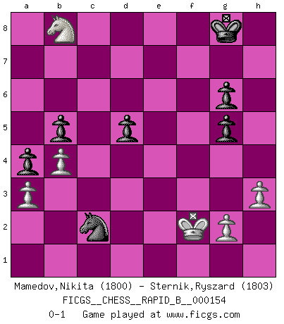 Last move : 0-1 2010 September 12 15:44:59 [Event "FICGS__CHESS__RAPID_B__000154"] [Site "FICGS"] [Date "2010.06.30"] [Round "1"] [White "Mamedov,Nikita"] [Black "Sternik,Ryszard"] [Result "0-1"] [WhiteElo "1800"] [BlackElo "1803"] 1.d4 d5 2.c4 c6 3.cxd5 cxd5 4.Bf4 Nc6 5.e3 Nf6 6.Nc3 a6 7.Bd3 Bg4 8.f3 Bh5 9.Nge2 Bg6 10.O-O e6 11.e4 dxe4 12.Bxe4 Rc8 13.Kh1 Be7 14.a3 O-O 15.Rc1 Re8 16.b4 Nd5 17.Nxd5 exd5 18.Bxg6 hxg6 19.Qd2 Qd7 20.Rfe1 Bh4 21.Bg3 Bf6 22.Rc3 Re7 23.Re3 Rxe3 24.Qxe3 Re8 25.Qd3 Re6 26.Bf2 Qe8 27.h3 Na7 28.Kg1 Nb5 29.Kf1 Nd6 30.Nf4 Rxe1+ 31.Bxe1 Qc6 32.Ne2 Nc4 33.Bd2 b5 34.Qc3 Bd8 35.Bc1 Bb6 36.Qd3 Qf6 37.Kf2 Qe6 38.Bf4 Qe7 39.Bc1 Qh4+ 40.Kf1 Ba7 41.Nf4 Qg5 42.Qc3 Bb6 43.Nd3 Qf6 44.Nc5 a5 45.Qd3 a4 46.f4 g5 47.f5 g6 48.Nd7 Qxd4 49.Qxd4 Bxd4 50.fxg6 fxg6 51.Nb8 Be3 52.Bxe3 Nxe3+ 53.Kf2 Nc2 0-1 QGD Slav defense : Exchange variation Kingside Castling by player White (move 10) Kingside Castling by player Black (move 14) Player Black won this chess game. Follow this game move after move (download)Fischer, who may or may not be mad as a hatter, has every right to be horrified. (Jeremy Silman) Korrekt heißt in Deutschland die Haltung eines Mannes, dessen Benehmen nach dem Urteile seiner Nachbarn seiner Stellung angemessen ist. Um korrekt zu sein, muß man sich der Meinung der anderen anpassen... (Emanuel Lasker) Bobby es la celebridad menos entendida y malinterpretada que camina el la faz de esta tierra. (Yasser Seirawan) La menace est plus forte que l'exécution. (Aaron Nimzovitch) If I had no sense of humor, I would long ago have committed suicide. (Mahatma Gandhi)