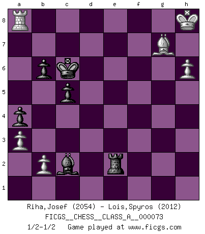 Last move : 1/2-1/2 2010 July 28 23:17:57 [Event "FICGS__CHESS__CLASS_A__000073"] [Site "FICGS"] [Date "2010.06.30"] [Round "1"] [White "Riha,Josef"] [Black "Lois,Spyros"] [Result "1/2-1/2"] [WhiteElo "2054"] [BlackElo "2012"] 1.c4 e5 2.Nc3 Nc6 3.g3 g6 4.Bg2 Bg7 5.d3 d6 6.e4 f5 7.Nge2 Nf6 8.O-O O-O 9.Nd5 Ne7 10.Nxf6+ Bxf6 11.Qc2 fxe4 12.dxe4 Be6 13.Be3 Qd7 14.f4 a5 15.c5 a4 16.fxe5 Bxe5 17.Nd4 Bxd4 18.Bxd4 Nc6 19.Be3 Rxf1+ 20.Bxf1 Ne5 21.Qc3 Qg7 22.Be2 dxc5 23.Bxc5 Nc6 24.Qxg7+ Kxg7 25.Be3 Ra5 26.Kf2 Kf7 27.h4 Ne5 28.Bd4 Ng4+ 29.Kf3 c5 30.Bc3 Ra8 31.Kf4 Nf6 32.g4 Re8 33.Rf1 Ke7 34.g5 Nh5+ 35.Bxh5 gxh5 36.Bf6+ Kd6 37.a3 Bb3 38.Rf2 Kd7 39.Rd2+ Ke6 40.Ke3 Rf8 41.Rf2 b6 42.Rf5 Rf7 43.Kf4 Bc2 44.Re5+ Kd7 45.Kf5 Bb3 46.g6 hxg6+ 47.Kxg6 Rf8 48.Re7+ Kc6 49.e5 Rg8+ 50.Bg7 Rd8 51.Kxh5 Rd2 52.e6 Rg2 53.Kh6 Re2 54.h5 Bxe6 55.Kg6 Kd6 56.Ra7 Bb3 57.h6 Bc2+ 58.Kg5 Rf2 59.Bc3 Rh2 60.Ra8 Rg2+ 61.Kf4 Re2 62.Bg7 Re1 63.Rd8+ Kc6 64.Kg5 Rg1+ 65.Kf6 Rg2 66.Ke7 Re2+ 67.Kf8 Kc7 68.Ra8 Kc6 69.Kg8 Bb3+ 70.Kh8 Bc2 1/2-1/2 English : Botvinnik system Kingside Castling by player White (move 8) Kingside Castling by player Black (move 8) This chess game ended in a draw. Follow this game move after move (download)I give 98 percent of my mental energy to Chess. Others give only 2 percent. (Bobby Fischer) Alles was am Schachbrett zählt sind gute Züge. (Robert James Fischer) La partida mas dura de ganar es una partida ganada. (Emanuel Lasker) Mais n'est-ce pas déjà le limiter injurieusement que d'appeler les échecs un jeu? N'est-ce pas aussi une science, un art, ou quelque chose qui, comme le cercueil de Mahomet entre ciel et terre, est suspendu entre l'un et l'autre, et qui réunit un nombre incroyable de contraires ? (Stefan Zweig) Memory is a complicated thing, a relative to truth, but not its twin. (Barbara Kingsolver, Animal Dreams)
