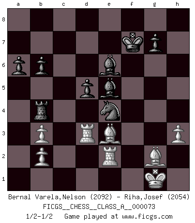 Last move : 1/2-1/2 2010 July 19 8:36:32 [Event "FICGS__CHESS__CLASS_A__000073"] [Site "FICGS"] [Date "2010.06.30"] [Round "1"] [White "Bernal Varela,Nelson"] [Black "Riha,Josef"] [Result "1/2-1/2"] [WhiteElo "2092"] [BlackElo "2054"] 1.e4 e6 2.d4 d5 3.Nd2 Nf6 4.e5 Nfd7 5.Bd3 c5 6.c3 Nc6 7.Ne2 cxd4 8.cxd4 f6 9.Nf4 Nxd4 10.Qh5+ Ke7 11.exf6+ Nxf6 12.Ng6+ hxg6 13.Qxh8 Kf7 14.O-O e5 15.Nb3 Nxb3 16.axb3 Be6 17.Re1 e4 18.Bf1 Rc8 19.Be3 a6 20.Rad1 Qd6 21.Qh4 Be7 22.Qf4 Qxf4 23.Bxf4 Rc6 24.f3 Rb6 25.fxe4 Nxe4 26.Rd3 Bf6 27.Re2 g5 28.Bc1 Rb5 29.Rc2 g4 30.Be3 Rb4 31.h3 gxh3 32.gxh3 Be5 33.Bg2 b6 34.Re2 Bf6 35.Kh2 Be5+ 36.Kg1 1/2-1/2 French : Tarrasch, Closed variation Kingside Castling by player White (move 14) This chess game ended in a draw. Follow this game move after move (download)White lost because he failed to remember the right continuation and had to think up the moves himself. (Siegbert Tarrasch) Es genügt nicht ein guter Spieler zu sein, man muß auch gut spielen. (Siegbert Tarrasch) La mitad de las variaciones que son calculadas en una partida de torneo, resultan ser completamente superfluas. Desafortunadamente, nadie sabe por adelantado cual mitad. (Jan Tinman) Aux échecs, l'amour-propre est satisfait quand on remporte la victoire, mais il n'y a pas de honte à être battu. (Benjamin Franklin) For peace of mind, resign as general manager of the universe. (Douglas Adams)