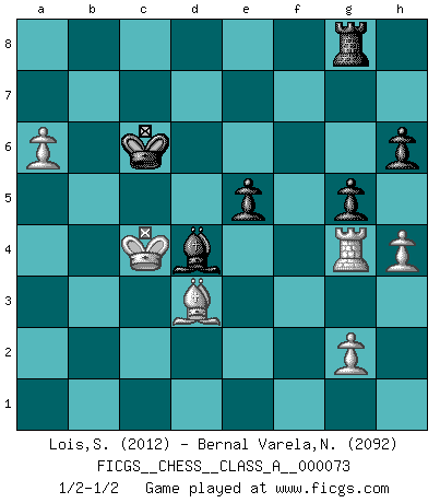 Last move : 1/2-1/2 2010 August 5 5:25:43 [Event "FICGS__CHESS__CLASS_A__000073"] [Site "FICGS"] [Date "2010.06.30"] [Round "1"] [White "Lois,Spyros"] [Black "Bernal Varela,Nelson"] [Result "1/2-1/2"] [WhiteElo "2012"] [BlackElo "2092"] 1.e4 c5 2.Nf3 d6 3.d4 cxd4 4.Nxd4 Nf6 5.Nc3 a6 6.f3 e5 7.Nb3 Be6 8.Be3 Nbd7 9.Qd2 b5 10.a4 b4 11.Nd5 Bxd5 12.exd5 Nb6 13.Bxb6 Qxb6 14.a5 Qb7 15.Bc4 Be7 16.Ra4 Rb8 17.Nc1 Bd8 18.Nd3 Nxd5 19.Nxe5 O-O 20.Qxd5 Qxd5 21.Bxd5 dxe5 22.Ke2 Be7 23.Rd1 Rfd8 24.Bc4 Rxd1 25.Kxd1 Ra8 26.Kd2 Kf8 27.c3 bxc3+ 28.Kxc3 Bc5 29.b4 Bg1 30.h3 Ke7 31.b5 axb5 32.Bxb5 Kd6 33.a6 Ba7 34.Rc4 Bc5 35.f4 f6 36.fxe5+ fxe5 37.Rh4 Bd4+ 38.Kb4 Rh8 39.Bd3 Rb8+ 40.Ka3 h6 41.Rg4 g5 42.h4 Rg8 43.Kb4 Kc6 44.Kc4 1/2-1/2 Sicilian : Najdorf Kingside Castling by player Black (move 19) This chess game ended in a draw. Follow this game move after move (download)What would Chess be without silly mistakes ? (Kurt Richter) Die starken Figuren des Gegners muss man abtauschen. (José Raúl Capablanca) La última cosa en que Fischer estaba interesado era en tonterías, siempre y cuando el Ajedrez estuviera involucrado. (Elie Agur) Dieu déplace le joueur, et celui-ci la pièce. Quel Dieu derrière Dieu commence donc la trame ? Arturo Perez-Reverte (prix de littérature policière 1993). I don't know, I don't care, and it doesn't make any difference. (Albert Einstein)