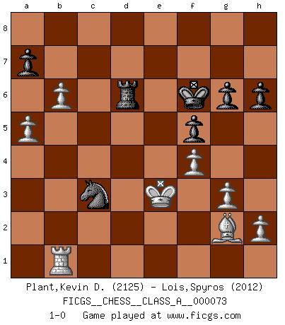 Last move : 1-0 2010 October 2 14:52:30 [Event "FICGS__CHESS__CLASS_A__000073"] [Site "FICGS"] [Date "2010.06.30"] [Round "1"] [White "Plant,Kevin D."] [Black "Lois,Spyros"] [Result "1-0"] [WhiteElo "2125"] [BlackElo "2012"] 1.c4 e5 2.g3 Nc6 3.Nc3 g6 4.Bg2 Bg7 5.Nf3 d6 6.O-O f5 7.d3 Nf6 8.Nd5 O-O 9.Bg5 Kh8 10.b4 Be6 11.Bh4 h6 12.Nxf6 Bxf6 13.b5 Ne7 14.Bxf6+ Rxf6 15.Qb3 Rb8 16.Qa3 c5 17.Nd2 Qb6 18.e3 Kg7 19.f4 Rd8 20.Qc3 exf4 21.exf4 d5 22.Rfe1 Rd6 23.Nf3 Rd8 24.Re5 Nc8 25.a4 Bf7 26.a5 Qd6 27.cxd5 Ne7 28.Ng5 Nxd5 29.Nxf7 Nxc3 30.Nxd6 Rfxd6 31.Rxc5 Ne2+ 32.Kf2 Nd4 33.Bxb7 R8d7 34.Bc8 Nb3 35.Bxd7 Nxc5 36.Bc6 Nxd3+ 37.Ke2 Nb4 38.Bg2 Kf6 39.Rb1 Na2 40.Ke3 Nc3 41.b6 1-0 English Opening Kingside Castling by player White (move 6) Kingside Castling by player Black (move 8) Player White won this chess game. Follow this game move after move (download)The tactician knows what to do when there is something to do; whereas the strategian knows what to do when there is nothing to do. (Gerald Abrahams) Schach verlangt totale Konzentration. (Robert James Fischer) No es suficiente ser un buen jugador, se debe también de jugar bién. (Siegbert Tarrasch) Celui qui prend des risques peut perdre, celui qui n'en prend pas perd toujours. (Xavier Tartacover) Somewhere in the world there is an epigram for every dilemma. (Hendrik Willem van Loon)