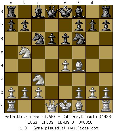 Last move : 1-0 2006 December 30 14:56:52 [Event "FICGS__CHESS__CLASS_D__000018"] [Site "FICGS"] [Date "2006.11.08"] [Round "1"] [White "Valentin,Florea"] [Black "Cabrera,Claudio"] [Result "1-0"] [WhiteElo "1765"] [BlackElo "1433"] 1.e4 c5 2.Nf3 Nc6 3.d4 cxd4 4.Nxd4 Nf6 5.Nc3 e6 6.Ndb5 d6 7.Bf4 1-0 This chess game has been lost on time (started : 2006.11.08 13:6:50) Sicilian defense Player White won this chess game. Follow this game move after move (download)Excellence at Chess is one mark of a scheming mind. (Sir Arthur Conan Doyle) Ich würde mich als ganz normalen Jungen bezeichnen [Im Alter von 12]. (Sergej Karjakin) Para mi, el Ajedrez es la vida y cada partida es como una nueva vida. Todo jugador de Ajedrez suele vivir muchas vidas durante su vida. (Eduard Gufeld) J'apprécie les joueurs d'est-indienne, c'est grâce à eux que je nourris ma famille depuis tant d'années. (Petrosian) Players are not good because they find tactics, it is about the way to find the positions in which those tactics are hidden. (Luc-Olivier Leclerc)