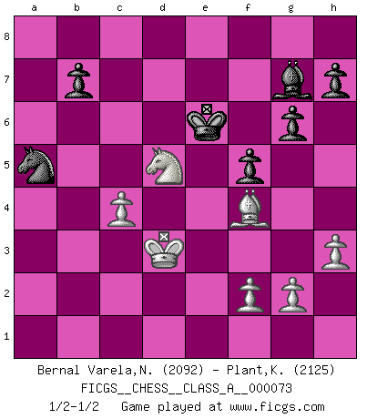 Last move : 1/2-1/2 2010 November 11 13:12:22 [Event "FICGS__CHESS__CLASS_A__000073"] [Site "FICGS"] [Date "2010.06.30"] [Round "1"] [White "Bernal Varela,Nelson"] [Black "Plant,Kevin D."] [Result "1/2-1/2"] [WhiteElo "2092"] [BlackElo "2125"] 1.e4 g6 2.d4 Bg7 3.Nc3 c6 4.Nf3 d6 5.Be2 Bg4 6.Be3 Nd7 7.Qd2 Ngf6 8.h3 Bxf3 9.Bxf3 O-O 10.O-O Rc8 11.Rfd1 Qc7 12.a4 c5 13.Nb5 Qb8 14.c3 a6 15.Na3 e6 16.dxc5 Nxc5 17.Qxd6 Qxd6 18.Rxd6 Nxa4 19.Ra2 Rc7 20.Nc2 Nc5 21.e5 Nd5 22.Bd4 Nd3 23.Bxd5 exd5 24.Rxd5 Nf4 25.Rda5 Re8 26.Ne3 Nd3 27.Rd5 Nxe5 28.Ra1 Rd7 29.Rxd7 Nxd7 30.Rd1 Re7 31.Nd5 Re6 32.Nc7 Re7 33.Be3 Nf8 34.Nd5 Rd7 35.Kf1 f5 36.b3 Kf7 37.Ke2 Rd6 38.c4 Nd7 39.Bf4 Re6+ 40.Ne3 Nc5 41.b4 Nb3 42.Rd7+ Re7 43.Rxe7+ Kxe7 44.Kd3 Ke6 45.Nd5 a5 46.bxa5 Nxa5 1/2-1/2 Robatsch defense Kingside Castling by player Black (move 9) Kingside Castling by player White (move 10) This chess game ended in a draw. Follow this game move after move (download)A man without frontiers. He didn't divide the East and the West, he brought them together in their admiration for him. (Ljubomir Ljubojevic, about Bobby Fischer's death) Ich organisiere ein großes Turnier, was mich etwa 120000 Dollar kostet. Ich denke, das ist das erste Mal in der Schachgeschichte, daß ein Schachgroßmeister auch als Mäzen auftritt. (Miguel Najdorf) EL Ajedrez es como la vida. (Boris Spassky) Les échecs, c'est l'art d'analyser. (Mikhail Botvinnik) As the days dwindle down... to a precious few. (Maxwell Anderson)