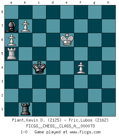 Last move : 1-0 2011 June 6 9:7:7 [Event "FICGS__CHESS__CLASS_A__000073"] [Site "FICGS"] [Date "2010.06.30"] [Round "1"] [White "Plant,Kevin D."] [Black "Fric,Lubos"] [Result "1-0"] [WhiteElo "2125"] [BlackElo "2162"] 1.e4 c5 2.Nf3 d6 3.d4 cxd4 4.Nxd4 Nf6 5.Nc3 a6 6.Be3 e5 7.Nb3 Be6 8.Nd2 Nc6 9.Nc4 b5 10.Nb6 Rb8 11.Nbd5 Ng4 12.Bc1 b4 13.Nb1 f5 14.Bc4 fxe4 15.O-O Qd7 16.Nc7+ Qxc7 17.Bxe6 Nf6 18.c3 bxc3 19.Nxc3 Nd4 20.Nd5 Qb7 21.Nxf6+ gxf6 22.Qh5+ Kd8 23.Bh3 Qg7 24.Qd1 f5 25.Be3 Rb4 26.Bxd4 exd4 27.Bxf5 d5 28.Rc1 Bd6 29.Rc6 Ke7 30.Qh5 h6 31.Rxa6 Rc4 32.Ra5 Qg5 33.Qh3 Rc5 34.Rxc5 Bxc5 35.b4 Bd6 36.Bc8 Rd8 37.Qe6+ Kf8 38.b5 d3 39.b6 h5 40.b7 Bb8 41.h4 Qxh4 42.Qh6+ Kf7 43.g3 Qf6 44.Qxh5+ Ke7 45.Bh3 Ba7 46.Qg4 d2 47.a4 Kd6 48.a5 Ke5 49.Qe2 Qf3 50.Qxf3 exf3 51.Rd1 Rg8 52.Rxd2 Rxg3+ 53.Kh2 Rg7 54.Bc8 Ke4 55.Kh3 d4 56.a6 d3 57.Rb2 Bb8 58.Kh4 Rg8 59.Bd7 Kd4 60.Ra2 Ba7 61.Bf5 Rd8 62.Kg4 Kc4 63.Kxf3 d2 64.Bc2 d1B+ 65.Bxd1 Rxd1 66.Ke4 Re1+ 67.Kf5 Kb3 68.Ra5 Kc4 69.f4 Rb1 70.Ke6 1-0 Sicilian : Najdorf, Byrne (English) attack Kingside Castling by player White (move 15) 10 pieces endgame at move 63 : White KRBPPP , Black KRBP WHITE : King + 1 Rook 1 Bishop 3 Pawns BLACK : King + 1 Rook 1 Bishop 1 Pawn Promotion Bishop by player Black (move 64) 9 pieces endgame at move 65 : White KRBPPP , Black KRB WHITE : King + 1 Rook 1 Bishop 3 Pawns BLACK : King + 1 Rook 1 Bishop 8 pieces endgame at move 65 : White KRPPP , Black KRB WHITE : King + 1 Rook 3 Pawns BLACK : King + 1 Rook 1 Bishop Player White won this chess game. Follow this game move after move (download)The game of Chess is not merely an idle amusement; several very valuable qualities of the mind are to be acquired and strengthened by it, so as to become habits ready on all occasions; for life is a kind of Chess. (Benjamin Franklin) Im Fernschach kannst du während dem Spiel rauchen. (John Christen Knudsen) Aquel que teme a un Peón de Reina aislado, debería de retirarse del Ajedrez. (Siegbert Tarrasch) Mais l'homme est une créature légère et illogique : semblable au joueur d'échecs, il n'aime que le processus du but à atteindre, non le but lui-même. (Dostoïevsky) Fortune favours the audacious. (Desiderius Erasmus)