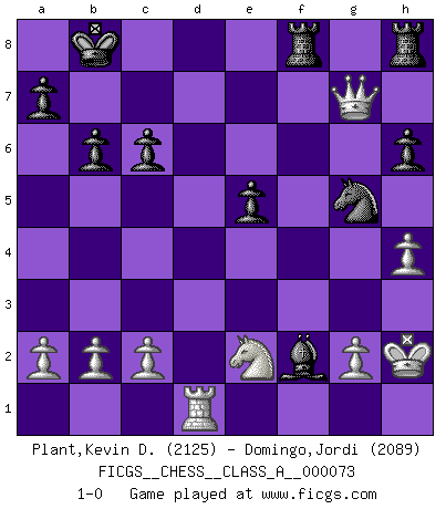 Last move : 1-0 2010 December 21 17:53:41 [Event "FICGS__CHESS__CLASS_A__000073"] [Site "FICGS"] [Date "2010.06.30"] [Round "1"] [White "Plant,Kevin D."] [Black "Domingo,Jordi"] [Result "1-0"] [WhiteElo "2125"] [BlackElo "2089"] 1.e4 e5 2.Nf3 f5 3.Nxe5 Qf6 4.d4 d6 5.Nc4 fxe4 6.Nc3 Qg6 7.f3 exf3 8.Qxf3 Nf6 9.Ne3 Nc6 10.Bd3 Qf7 11.Bc4 Qg6 12.Ned5 Kd8 13.O-O Nxd4 14.Qf2 Ne6 15.Re1 Qg4 16.Bd3 Qd4 17.Be3 Qe5 18.Bf5 Nxd5 19.Bg5+ Nxg5 20.Rxe5 dxe5 21.Nxd5 c6 22.Bxc8 Rxc8 23.Nc3 Kc7 24.h4 b6 25.Qf5 Bc5+ 26.Kh2 h6 27.Rd1 Bd4 28.Ne2 Rcf8 29.Qg6 Bf2 30.Qd6+ Kb7 31.Qd7+ Kb8 32.Qxg7 1-0 Latvian counter-gambit Kingside Castling by player White (move 13) Player White won this chess game. Follow this game move after move (download)I like the moment when I break a man's ego. (Bobby Fischer) Ich habe Putins Aufstieg an die Macht beobachtet und seine Politik, die demokratischen Institutionen meines Landes zu zerstören. (Garry Kasparov) Juega la Apertura como un libro, el Juego Medio como un mago y los Finales como una máquina. (Spielmann) Avec des compensations pour le matériel en plus... (Anonyme) Excelling at chess has long been considered a symbol of more general intelligence. That is an incorrect assumption in my view, as pleasant as it might be. But for the purposes of argument and investigation, chess is, in Russkin-Gutman's words, 'an unparalleled laboratory, since both the learning process and the degree of ability obtained can be objectified and quantified, providing an excellent comparative framework on which to use rigorous analytical techniques.' (The Chess Master and the Computer, by Garry Kasparov - 2010)