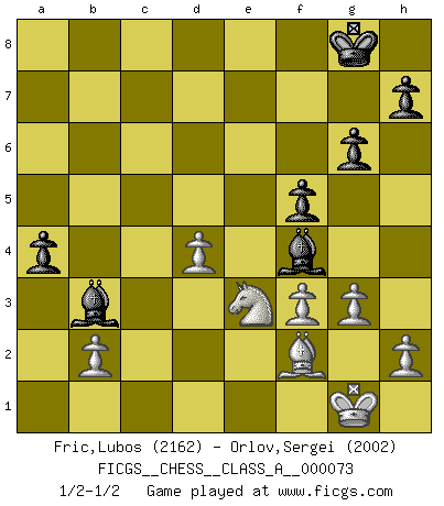 Last move : 1/2-1/2 2011 February 28 16:45:40 [Event "FICGS__CHESS__CLASS_A__000073"] [Site "FICGS"] [Date "2010.06.30"] [Round "1"] [White "Fric,Lubos"] [Black "Orlov,Vladimir"] [Result "1/2-1/2"] [WhiteElo "2162"] [BlackElo "2002"] 1.d4 Nf6 2.c4 e6 3.Nf3 d5 4.Nc3 Nbd7 5.Bg5 Bb4 6.cxd5 exd5 7.e3 c5 8.Bd3 Qa5 9.Qc2 c4 10.Bf5 O-O 11.O-O Re8 12.Nd2 g6 13.Bxd7 Nxd7 14.f3 Bf8 15.e4 dxe4 16.Ncxe4 b5 17.a4 Bb7 18.axb5 Qxb5 19.Be3 f5 20.Nc3 Qb4 21.Bf2 Nb6 22.Rfb1 Rec8 23.Rd1 a5 24.Na4 Nxa4 25.Rxa4 Qb5 26.Rxc4 a4 27.Ra1 Bb4 28.Rc1 Re8 29.Rc7 Bd6 30.Rc3 Re2 31.Re3 Rc8 32.Qd1 Rxe3 33.Bxe3 Qd3 34.Rxc8+ Bxc8 35.Bf2 Bd7 36.Qc1 Bf4 37.Qc4+ Qxc4 38.Nxc4 Be6 39.Ne3 Bb3 40.g3 1/2-1/2 Queen's pawn game Kingside Castling by player Black (move 10) Kingside Castling by player White (move 11) This chess game ended in a draw. Follow this game move after move (download)All I want to do, ever, is just play Chess. (Bobby Fischer) Ein typischer, sehr verbreiteter Gedankenschädling ist der, daß der betreffende Amateur von der Annanhme ausgeht, daß jeder einzelne Zug etwas zu leisten habe. (Aaron Nimzowitsch) Desconfianza es la característica mas necesaria de un jugador de Ajedrez. (Siegbert Tarrasch) L'action d'une oeuvre littéraire se déroule sur un champ de bataille. Les masques et les types du drame moderne correspondent aux pièces du jeu d'échecs. L'intrigue correspond aux coups et aux gambits, c'est à dire aux techniques du jeu telles qu'utilisées et interprétées par les joueurs. Les tactiques et les péripéties [mouvements] correspondent aux coups exécutés par l'adversaire. (Viktor Shklovsky) Macintosh - we might not get everything right, but at least we knew the century was going to end. (Douglas Adams)