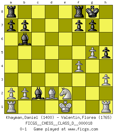 Last move : 0-1 2006 December 26 15:43:54 [Event "FICGS__CHESS__CLASS_D__000018"] [Site "FICGS"] [Date "2006.11.08"] [Round "1"] [White "Khayman,Daniel"] [Black "Valentin,Florea"] [Result "0-1"] [WhiteElo "1400"] [BlackElo "1765"] 1.g4 d5 2.Bg2 c6 3.h3 e5 4.d3 Bd6 5.e4 h5 6.exd5 cxd5 7.g5 Ne7 8.Ne2 Nbc6 9.d4 Bf5 10.dxe5 Bxe5 11.f4 Bc7 12.Nbc3 Bb6 13.Nxd5 Nxd5 14.Qxd5 Qxd5 15.Bxd5 Nb4 16.Bb3 Nxc2+ 17.Bxc2 Bxc2 18.Bd2 O-O 0-1 Grob's attack Kingside Castling by player Black (move 18) Player Black won this chess game. Follow this game move after move (download)Let the perfectionist play postal. (Yasser Seirawan) Weshalb minderdergeübte Spieler mit g2-g4 beginnen? Die betreffenden sind unschlüssig, ob sie nun rechts (h4) oder links (f4) beginnen sollen, und in ihrer Ratlosigkeit entschliessen sie sich nach guter Bürgerart dazu, den goldenen Mittelweg zu wählen. (Aaron Nimzowitsch) Yo he agregado estos principios a la ley: pongan los Caballos en acción antes de que los dos Alfiles sean desarrollados. (Emanuel Lasker) Aidez vos pièces, elles vous aideront. (Paul Morphy) Whenever people agree with me, I always feel I must be wrong. (Oscar Wilde)