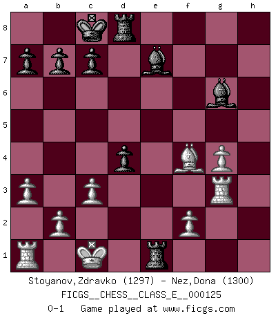 Last move : 0-1 2010 August 26 16:28:4 [Event "FICGS__CHESS__CLASS_E__000125"] [Site "FICGS"] [Date "2010.06.30"] [Round "1"] [White "Stoyanov,Zdravko"] [Black "Nez,Dona"] [Result "0-1"] [WhiteElo "1297"] [BlackElo "1300"] 1.e4 e5 2.Nf3 Nc6 3.Bb5 f5 4.Bxc6 dxc6 5.c3 Nf6 6.d3 Be7 7.Bg5 Qd6 8.exf5 Bxf5 9.d4 O-O-O 10.Nxe5 h6 11.Bh4 Nd7 12.Bg3 Nxe5 13.Bxe5 Qg6 14.Nd2 Qxg2 15.Qf3 Qxf3 16.Nxf3 Be4 17.Ke2 Rhf8 18.Rhg1 Bxf3+ 19.Kd3 g5 20.Bg7 Rg8 21.Bxh6 Rd6 22.Rg3 g4 23.Be3 c5 24.h3 cxd4 25.Bf4 Re6 26.hxg4 Be4+ 27.Kd2 Rd8 28.Kc1 Bg6 29.a3 Re1+ 0-1 Ruy Lopez : Schliemann defense Queenside Castling by player Black (move 9) Player Black won this chess game. Follow this game move after move (download)Some sacrifices are sound; the rest are mine. (Mikhail Tal) Woher wissen wir, daß der Neanderthaler Blindschach gespielt hat? -- Bei Ausgrabungen wurden keine Schachbretter und Figuren gefunden. (Anonymous) Nunca nadie ha ganado una partida de Ajedrez rindiendose. (Unknown) Il a essayé de se convaincre qu'il pourrait empêcher toutes les erreurs et ne jamais perdre. L'horreur ! Gary Kasparov au sujet de Robert Fischer. He is a liar. I just don't know what the lie is yet. (Horatio Caine, C.S.I. Miami)