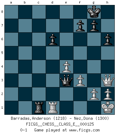 Last move : 0-1 2010 August 14 18:39:29 [Event "FICGS__CHESS__CLASS_E__000125"] [Site "FICGS"] [Date "2010.06.30"] [Round "1"] [White "Barradas,Anderson"] [Black "Nez,Dona"] [Result "0-1"] [WhiteElo "1218"] [BlackElo "1300"] 1.e4 e5 2.Nf3 Nc6 3.Bb5 a6 4.Ba4 Nf6 5.O-O Be7 6.Re1 O-O 7.c3 b5 8.Bb3 Bb7 9.d3 Bc5 10.Bg5 d6 11.Nbd2 h6 12.Bxf6 Qxf6 13.Bd5 Rab8 14.b4 Bb6 15.a4 Ne7 16.Bxb7 Rxb7 17.axb5 axb5 18.c4 bxc4 19.Nxc4 Nc6 20.Qa4 Nd4 21.Nxd4 exd4 22.Nxb6 Rxb6 23.Rac1 Rc8 24.Qa7 Rxb4 25.Rxc7 Rxc7 26.Qxc7 Rb2 27.f3 Rd2 28.Qc4 Qg6 29.Qc8+ Kh7 30.Qh3 Rxd3 31.Re2 Rd1+ 32.Kf2 d3 33.Re1 Rd2+ 34.Kg1 Rc2 35.Rd1 Kg8 36.Rxd3 Qg5 37.Rd1 Qe3+ 38.Kh1 Rc1 0-1 Ruy Lopez : Closed defense Kingside Castling by player White (move 5) Kingside Castling by player Black (move 6) Player Black won this chess game. Follow this game move after move (download)The Pin is mightier than the sword. (Fred Reinfeld) Später, ... hatte ich zunehmend Erfolg in entscheidenden Partien. Vielleicht weil ich eine einfache Wahrheit erkannte: nicht nur ich hatte Angst, auch mein Gegner. (Mikhail Nekhemyevich Tal) El Ajedrez es como la guerra en un tablero. (Bobby Fischer) Assurément je connaissais par expérience le mystérieux attrait de ce jeu royal, le seul entre tous les jeux inventés par les hommes qui échappe souverainement à la tyrannie du hasard, le seul où l'on ne doive sa victoire qu'à son intelligence ou plutôt à une certaine forme d'intelligence. Mais n'est-ce pas déjà le limiter injurieusement que d'appeler les échecs un jeu ? N'est-ce pas une science, un art ou quelque chose qui, comme le cercueil de Mahomet entre ciel et terre, est suspendu entre l'un et l'autre, et qui réunit un nombre incroyable de contraires ? [...] C'est une pensée qui ne mène à rien, une mathématique qui n'établit rien, un art qui ne laisse pas d'uvre, une architecture sans matière; et il l'a prouvé néanmoins qu'il était plus durable, à sa manière, que les livres ou que tout autre monument, ce jeu unique qui appartient à tous les peuples et à tous les temps, et dont personne ne sait quel dieu en fit don à la terre pour tuer l'ennui, pour aiguiser l'esprit et stimuler l'âme. Où commence-t-il, où finit-il ? (Stefan Zweig) Real knowledge is to know the extent of one's ignorance. (Confucius)