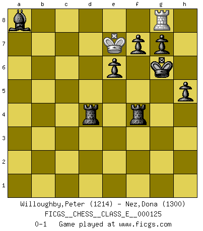 Last move : 0-1 2010 September 19 20:54:18 [Event "FICGS__CHESS__CLASS_E__000125"] [Site "FICGS"] [Date "2010.06.30"] [Round "1"] [White "Willoughby,Peter"] [Black "Nez,Dona"] [Result "0-1"] [WhiteElo "1214"] [BlackElo "1300"] 1.d4 d5 2.Nf3 Nc6 3.e3 Bg4 4.Be2 Nf6 5.h3 Bf5 6.b3 e6 7.O-O Be7 8.Bb2 Ne4 9.Nbd2 O-O 10.Ne5 Nxe5 11.dxe5 Bb4 12.Nxe4 Bxe4 13.f3 Bg6 14.f4 Rc8 15.a3 Bc5 16.Bd4 Qe7 17.b4 Bb6 18.c4 dxc4 19.Bxc4 Rfd8 20.Be2 c5 21.bxc5 Bxc5 22.Qa4 a6 23.Kh2 Bxd4 24.exd4 Bc2 25.Qb4 Qxb4 26.axb4 Rxd4 27.Rac1 Rd2 28.Bf3 Rc4 29.Bxb7 Rxb4 30.Bxa6 h6 31.Kg1 Bg6 32.g3 R4b2 33.Rfd1 Rg2+ 34.Kf1 Rxg3 35.Be2 Rxh3 36.Ke1 Rh1+ 37.Kf2 Rh2+ 38.Ke3 Rhxe2+ 39.Kd4 Rb4+ 40.Kc5 Rxf4 41.Ra1 Rxe5+ 42.Kd6 R5e4 43.Ke7 Rd4 44.Ra8+ Kh7 45.Rc1 h5 46.R1c8 Be4 47.Rh8+ Kg6 48.Rhg8 Bxa8 0-1 Queen's pawn game, Chigorin variation Kingside Castling by player White (move 7) Kingside Castling by player Black (move 9) 10 pieces endgame at move 48 : White KR , Black KRRBPPPP WHITE : King + 1 Rook BLACK : King + 2 Rooks 1 Bishop 4 Pawns Player Black won this chess game. Follow this game move after move (download)One doesn't have to play well, it's enough to play better than your opponent. (Siegbert Tarrasch) Ich verlor meine Bürgerrechte, mein Gehalt wurde mir nicht mehr bezahlt und ich wurde zensiert und durfte nicht mehr ins Ausland reisen. [nach dem Match Fischer-Taimanov 6:0] (Mark Taimanov) Evita las multitudes. Haz independientemente tu propio razonamiento. Trata de ser el jugador de Ajedrez, no la pieza de Ajedrez. (Ralph Charell) Celui qui prend des risques peut perdre, celui qui n'en prend pas perd toujours. (Xavier Tartacover) It is a good thing for an uneducated man to read books of quotations. (Winston Churchill)