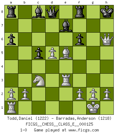 Last move : 1-0 2010 July 5 21:8:31 [Event "FICGS__CHESS__CLASS_E__000125"] [Site "FICGS"] [Date "2010.06.30"] [Round "1"] [White "Todd,Daniel"] [Black "Barradas,Anderson"] [Result "1-0"] [WhiteElo "1222"] [BlackElo "1218"] 1.e4 c5 2.c3 e6 3.Nf3 a6 4.d4 b5 5.Bd3 Nc6 6.Be3 d6 7.O-O Bb7 8.d5 exd5 9.exd5 Nce7 10.c4 bxc4 11.Bxc4 Nf6 12.Nc3 Nd7 13.Re1 Nf5 14.Bf4 Be7 15.Bd3 Ne5 16.Bxf5 O-O 17.Nxe5 dxe5 18.Bxe5 f6 19.Qh5 g6 20.Bxg6 hxg6 21.Qxg6+ Kh8 22.Re3 Bc8 23.Qh6+ 1-0 Sicilian : Alapin's variation (2.c3) Kingside Castling by player White (move 7) Kingside Castling by player Black (move 16) Player White won this chess game. Follow this game move after move (download)I guess a certain amount of temperament is expected of Chess geniuses. (Ron Gross) Wie gewinnt Tal? Er entwickelt alle seine Figuren in die Brettmitte und opfert sie dann irgendwo. (Robert James Fischer) No es suficiente ser un buen jugador, se debe también de jugar bién. (Siegbert Tarrasch) La vie est comme un jeu d'échecs : nous esquissons un plan, mais celui-ci est tributaire de ce que daignent faire l'adversaire aux échecs et le destin dans la vie. (Arthur Schopenhauer) Kids, you tried your best and you failed miserably. The lesson is, never try. (Simpsons)