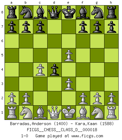 Last move : 1-0 2007 January 1 15:26:52 [Event "FICGS__CHESS__CLASS_D__000018"] [Site "FICGS"] [Date "2006.11.08"] [Round "1"] [White "Barradas,Anderson"] [Black "Kara,Kaan"] [Result "1-0"] [WhiteElo "1400"] [BlackElo "1588"] 1.d4 d5 2.c4 e5 3.dxe5 d4 4.e3 1-0 This chess game has been lost on time (started : 2006.11.08 13:6:50) QGD : Albin counter-gambit Player White won this chess game. Follow this game move after move (download)One doesn't have to play well, it's enough to play better than your opponent. (Siegbert Tarrasch) Den Ruhm habe ich schon, jetzt brauche ich noch das Geld. (Wilhelm Steinitz) Puntos débiles o agujeros en la posición de tu oponente deben de ser ocupados por piezas, no Peones. (Siegbert Tarrasch) On peut tirer plus d'utilité d'une partie perdue que de 100 parties gagnées. (Capablanca) I have opinions of my own - strong opinions - but I don't always agree with them. (George Bush)