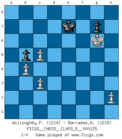 Last move : 1-0 2010 July 5 15:1:11 [Event "FICGS__CHESS__CLASS_E__000125"] [Site "FICGS"] [Date "2010.06.30"] [Round "1"] [White "Willoughby,Peter"] [Black "Barradas,Anderson"] [Result "1-0"] [WhiteElo "1214"] [BlackElo "1218"] 1.d4 d5 2.Nf3 Nf6 3.e3 Bg4 4.Be2 Nc6 5.Ne5 Bxe2 6.Qxe2 Nxe5 7.dxe5 Ne4 8.f4 e6 9.O-O Qd7 10.Nd2 a6 11.Nxe4 dxe4 12.Rd1 Qc6 13.b3 Bc5 14.Kf2 O-O 15.a4 Bb4 16.Ba3 Qc5 17.Bxb4 Qxb4 18.Rd4 Qe7 19.Rxe4 Rfd8 20.Rd4 Qh4+ 21.Kg1 Rxd4 22.g3 Qh6 23.exd4 Rd8 24.Rd1 Qg6 25.Qd3 c5 26.Qxg6 hxg6 27.c3 b6 28.Kf2 b5 29.Ke2 f6 30.dxc5 Rxd1 31.Kxd1 Kf7 32.axb5 axb5 33.Kd2 Ke7 34.Kd3 Kd7 35.Ke4 Kc6 36.Kd4 g5 37.b4 gxf4 38.gxf4 fxe5+ 39.Kxe5 Kd7 40.f5 exf5 41.Kxf5 Ke7 42.Kg6 1-0 Queen's pawn game Kingside Castling by player White (move 9) Kingside Castling by player Black (move 14) 10 pieces endgame at move 39 : White KPPPPP , Black KPPP WHITE : King + 5 Pawns BLACK : King + 3 Pawns 9 pieces endgame at move 40 : White KPPPP , Black KPPP WHITE : King + 4 Pawns BLACK : King + 3 Pawns 8 pieces endgame at move 41 : White KPPPP , Black KPP WHITE : King + 4 Pawns BLACK : King + 2 Pawns Player White won this chess game. Follow this game move after move (download)He who fears an isolated Queen's Pawn should give up Chess. (Siegbert Tarrasch) Es tut gut, die Entwicklungsperiode von, [...] demokratischem Geist durchdringen zu lassen. Wie undemokratisch wäre es doch beispielsweise, den einen Offizier große Spaziertouren vornehmen zu lassen, während die anderen zu Hause säßen und sich entsetzlich langweilten. (Aaron Nimzowitsch) El Ajedrez te enseña a controlarl la excitación inicial que sientes cuando vez algo que parece bueno y te enseña a pensar objetivamente cuando te encuentras en problemas. (Stanley Kubrick) Que feriez-vous si vous étiez en train de jouer aux échecs et que la fin du monde arrive ? Je continuerais à jouer. (Saint Borromée) A clear conscience is usually the sign of a bad memory. (Unknown)