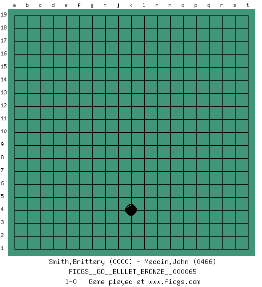Last move : 1-0 2010 June 30 21:12:11 [Event "FICGS__GO__BULLET_BRONZE__000065"] [Site "FICGS"] [Date "2010.06.30"] [Round "1"] [Black "Smith,Brittany"] [White "Maddin,John"] [Result "1-0"] [Rating 1 "0000"] [Rating 2 "0466"] 1.k4 1-0 This go game has been lost on time (started : 2010.06.30 20:40:22) Here are the names of the openings (joseki) played in the four corners : Player Black won this Go (weiqi, baduk) game. Follow this game move after move (download)While the Baroque rules of chess could only have been created by humans, the rules of go are so elegant, organic, and rigorously logical that if intelligent life forms exist elsewhere in the universe, they almost certainly play go. (Edward Lasker, international chess master) Good decisions come from experience, and experience comes from bad decisions. (Anonymous)