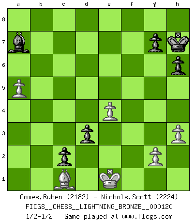 Last move : 1/2-1/2 2010 June 30 22:16:10 [Event "FICGS__CHESS__LIGHTNING_BRONZE__000120"] [Site "FICGS"] [Date "2010.06.30"] [Round "1"] [White "Comes,Ruben"] [Black "Nichols,Scott"] [Result "1/2-1/2"] [WhiteElo "2182"] [BlackElo "2224"] 1.e4 e5 2.Nf3 Nf6 3.d4 Nxe4 4.Bd3 d5 5.Nxe5 Nd7 6.O-O Nxe5 7.dxe5 Nc5 8.Nc3 c6 9.Ne2 Be7 10.Be3 O-O 11.Ng3 Nxd3 12.Qxd3 b6 13.Nf5 Bxf5 14.Qxf5 Qc8 15.Qd3 f6 16.exf6 Bxf6 17.c3 Qd7 18.a4 Rab8 19.b4 a5 20.Rab1 axb4 21.cxb4 d4 22.Bf4 Ra8 23.Bd2 Rfc8 24.a5 bxa5 25.bxa5 Qf7 26.Rfc1 c5 27.Rc4 Be5 28.f3 Bb8 29.h3 Qd5 30.Kf1 Ba7 31.Re1 Qf7 32.Bg5 Re8 33.Rxe8+ Rxe8 34.Rc1 h6 35.Bh4 Re3 36.Qa6 Kh7 37.Re1 Rxe1+ 38.Kxe1 c4 39.Qc6 Qf4 40.Qe4+ Qxe4+ 41.fxe4 c3 42.Bg3 d3 43.Be5 c2 44.Bf4 Bb8 45.Be3 Ba7 46.Bc1 1/2-1/2 Petrov : Modern attack, Symmetrical variation Kingside Castling by player White (move 6) Kingside Castling by player Black (move 10) This chess game ended in a draw. Follow this game move after move (download)The combination player thinks forward; he starts from the given position, and tries the forceful moves in his mind. (Emanuel Lasker) Konzentriere dich auf materielle Gewinne. Nimm, was dir dein Gegner gibt, ausser es gibt einen guten Grund der dagegenspricht. (Robert James Fischer) Yo adoro todas la posiciones. Denme una partida posicional difícil, y la jugaré. Pero posiciones totalmente ganadas, no las tolero. (Hein Donner) La guerre est enfant de la passion, la passion est enfant du narcissisme et le narcissisme est l'enfant. (...) Une autre partie ? (Thibault de Vassal) The next best thing to gambling and winning is gambling and loosing. (Nick Dandalos)