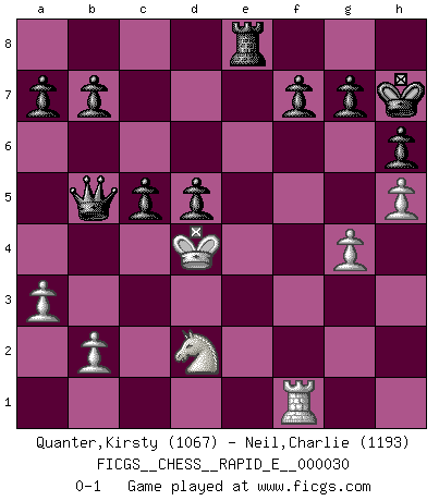 Last move : 0-1 2010 September 10 21:58:1 [Event "FICGS__CHESS__RAPID_E__000030"] [Site "FICGS"] [Date "2010.07.01"] [Round "1"] [White "Quanter,Kirsty"] [Black "Neil,Charlie"] [Result "0-1"] [WhiteElo "1067"] [BlackElo "1193"] 1.e4 e5 2.Nf3 Nf6 3.d4 Nxe4 4.Nxe5 d6 5.Nf3 d5 6.c4 Bb4+ 7.Bd2 Bxd2+ 8.Nbxd2 O-O 9.c5 Nc6 10.h3 Re8 11.Be2 Bf5 12.g4 Bg6 13.h4 h6 14.h5 Bh7 15.Bd3 Nc3 16.Ne5 Nxd1 17.Kxd1 Nxe5 18.Bxh7+ Kxh7 19.dxe5 Rxe5 20.Re1 Rxe1+ 21.Kxe1 Qe7+ 22.Kd1 Qxc5 23.a3 Qxf2 24.Kc2 Re8 25.Rf1 Qc5+ 26.Kd3 Qb5+ 27.Kd4 c5+ 0-1 Petrov : Modern attack, Symmetrical variation Kingside Castling by player Black (move 8) Player Black won this chess game. Follow this game move after move (download)Pawns: they are the soul of this game, they alone form the attack and defense. (Philidor) Stil? Ich habe keinen Stil! (Anatoly Karpov) Un buen sacrificio es aquel que aunque no sea necesariamente sólido, deja a tu oponente aturdido y confuso. (Rudolph Spielmann) Le profane ne songe pas à la somme de jouissance dont il se prive, qui méconnaît ce jeu aux ressources aussi variées que passionnantes. (Jean-Marie Jeanton-Lamarche) Never risk one's whole fortune unless supported by one's entire army. (Niccolo Machiavelli)
