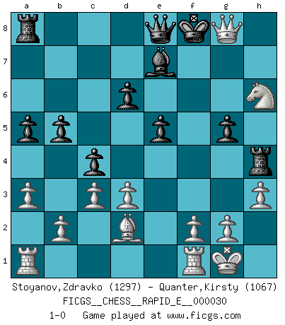 Last move : 1-0 2010 September 3 12:10:11 [Event "FICGS__CHESS__RAPID_E__000030"] [Site "FICGS"] [Date "2010.07.01"] [Round "1"] [White "Stoyanov,Zdravko"] [Black "Quanter,Kirsty"] [Result "1-0"] [WhiteElo "1297"] [BlackElo "1067"] 1.e4 e5 2.Nf3 Nc6 3.a3 d6 4.Bb5 Nge7 5.h3 a6 6.Ba4 b5 7.Bb3 Bb7 8.O-O Na5 9.Ba2 Bxe4 10.Ng5 Bd5 11.Bxd5 Nxd5 12.d3 h6 13.Qf3 hxg5 14.Qxd5 f6 15.Nc3 Be7 16.Bd2 Rh4 17.Qg8+ Bf8 18.Nd5 Nc6 19.Ne3 Nd4 20.c3 Nb3 21.Qxb3 g6 22.Qe6+ Be7 23.Nd5 c5 24.Nxf6+ Kf8 25.Ng4 a5 26.Qxg6 c4 27.Nh6 Qe8 28.Qg8+ 1-0 King's pawn game Kingside Castling by player White (move 8) Player White won this chess game. Follow this game move after move (download)Becoming successful at Chess allows you to discover your own personality. That's what I want for the kids I teach. (Saudin Robovic) Rubinstein ist ein Turmendspiel, welches die Götter vor tausenden von Jahren begannen. (Savielly Grigorievitsch Tartakower) No hay un Gran Maestro de Ajedrez que sea normal; solo se diferencían ellos por la magnitud de su locura. (Viktor Korchnoi) Dans le domaine de la peinture, de la gravure et de la sculpture, dès la première décennie de notre siècle, les artistes abandonnent la représentation de la partie d'échecs pour se concentrer sur les pièces, sur les échiquiers et sur toutes les variations auxquelles les unes et les autres peuvent donner lieu. On passe en quelque sorte d'un thème social à un thème musical (au sens de la musica médiévale, c'est-à-dire d'une notion qui inclue le rythme, l'harmonie, la construction et la déconstruction, etc.). Graphiquement et picturalement, l'échiquier apparaît comme une structure ouverte, dynamique, d'une richesse infinie, autorisant toutes les combinatoires et débouchant sur des mouvements et des rythmes de nature exponentielle. (Michel Pastoureau) There are 10 types of people in this world: those who understand binary and those who don't. (Anonymous)