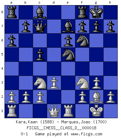 Last move : 0-1 2007 February 7 3:16:44 [Event "FICGS__CHESS__CLASS_D__000018"] [Site "FICGS"] [Date "2006.11.08"] [Round "1"] [White "Kara,Kaan"] [Black "Marques,Joao"] [Result "0-1"] [WhiteElo "1588"] [BlackElo "1700"] 1.e4 c5 2.Nc3 e6 3.g3 a6 4.Bg2 Nc6 5.d3 Qc7 6.Nf3 Nf6 7.O-O Be7 8.Re1 O-O 9.Bf4 d6 10.e5 dxe5 11.Bxe5 Nxe5 0-1 This chess game has been lost on time (started : 2006.11.08 13:6:50) Sicilian : Closed Kingside Castling by player White (move 7) Kingside Castling by player Black (move 8) Player Black won this chess game. Follow this game move after move (download)A man that will take back a move at Chess will pick a pocket. (Richard Fenton) Ein Springer auf f6 gegen die eigene Rochadestellung ist schlimmer als ein rostiger Nagel im Knie. (Efim Bogoljubov) Fischer sacrificó virtualmente todo lo que la mayoría de nosotros los 'debiles' (término que él usa) valoramos, respetamos y apreciamos por el amor de un astuto, a menudo hermoso tablero de juego, por el privilegio ambivalente de ser su mas grande maestro. (Paul Kollar) Vous m'avez demandé de vous exposer quel est le fondement de la prière. Je ne fais que préparer les pièces du jeu sur la table... Nous sera-t-il permis d'en adopter les règles et si nous les appliquons scrupuleusement nous ne tarderons pas à faire mat le Roi divin ! Il ne pourra échapper à nos mains. (Sainte Thérèse d'Avila, Chemin de perfection) The obstacle is the path. (Zen proverb)
