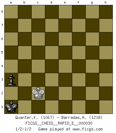 Last move : 1/2-1/2 2010 July 7 19:50:39 [Event "FICGS__CHESS__RAPID_E__000030"] [Site "FICGS"] [Date "2010.07.01"] [Round "1"] [White "Quanter,Kirsty"] [Black "Barradas,Anderson"] [Result "1/2-1/2"] [WhiteElo "1067"] [BlackElo "1218"] 1.e4 c5 2.d4 cxd4 3.Qxd4 Nc6 4.Qe3 e5 5.Bd2 Nf6 6.Nc3 Nd4 7.O-O-O Ng4 8.Qg3 d6 9.h3 Nf6 10.Be3 Ne6 11.Nd5 Nxd5 12.exd5 Nc7 13.f4 Qf6 14.fxe5 Qxe5 15.Qxe5+ dxe5 16.d6 Ne6 17.Bb5+ Bd7 18.Bxd7+ Kxd7 19.Nf3 f6 20.g4 Bxd6 21.h4 Rhd8 22.g5 Ke8 23.h5 Nf4 24.h6 g6 25.gxf6 Kf7 26.Ng5+ Kxf6 27.Nxh7+ Kf5 28.Bf2 b6 29.Bh4 Rd7 30.Nf6 Rf7 31.h7 Rh8 32.Rxd6 g5 33.Nd5 gxh4 34.Rxh4 Nxd5 35.Rxd5 R8xh7 36.Rxh7 Rxh7 37.Kd2 Ke4 38.Rd3 Rh2+ 39.Kc3 a6 40.b4 a5 41.bxa5 bxa5 42.a4 Rh8 43.Rg3 Rc8+ 44.Kd2 Kf4 45.Rc3 Rd8+ 46.Ke2 e4 47.Rc4 Rb8 48.Rc5 Rb2 49.Kd2 e3+ 50.Ke2 Ke4 51.Rc3 Kd4 52.Rd3+ Kc4 53.Kxe3 Rxc2 54.Ke4 Re2+ 55.Re3 Rxe3+ 56.Kxe3 Kb4 57.Kd3 Kxa4 58.Kc4 Ka3 59.Kb5 a4 60.Kc4 Ka2 61.Kc3 a3 62.Kc2 Ka1 1/2-1/2 Sicilian : Smith-Morra gambit Queenside Castling by player White (move 7) 10 pieces endgame at move 36 : White KRPPP , Black KRPPP WHITE : King + 1 Rook 3 Pawns BLACK : King + 1 Rook 3 Pawns 9 pieces endgame at move 41 : White KRPPP , Black KRPP WHITE : King + 1 Rook 3 Pawns BLACK : King + 1 Rook 2 Pawns 8 pieces endgame at move 41 : White KRPP , Black KRPP WHITE : King + 1 Rook 2 Pawns BLACK : King + 1 Rook 2 Pawns 7 pieces endgame at move 53 : White KRPP , Black KRP WHITE : King + 1 Rook 2 Pawns BLACK : King + 1 Rook 1 Pawn 6 pieces endgame at move 53 : White KRP , Black KRP WHITE : King + 1 Rook 1 Pawn BLACK : King + 1 Rook 1 Pawn 5 pieces endgame at move 55 : White KP , Black KRP WHITE : King + 1 Pawn BLACK : King + 1 Rook 1 Pawn 4 pieces endgame at move 56 : White KP , Black KP WHITE : King + 1 Pawn BLACK : King + 1 Pawn 3 pieces endgame at move 57 : White K , Black KP WHITE : King + BLACK : King + 1 Pawn This chess game ended in a draw. Follow this game move after move (download)No Chess Grandmaster is normal; they only differ in the extent of their madness. (Viktor Korchnoi) Frage: Was machen Sie mit den Preisen? Anwort: Ich habe Angst, dass meine Freundin davon neue Kleider kauft. (Loek van Wely) El Ajedrez es despiadado: debes de estar preparado para matar gente. (Nigel Short) Les échecs sont plus proches de l'art de l'assassinat que de l'art de la guerre. (Arturo Perez-Reverte) SEO proverb : Make your website optimized for human beings, not for search engines.