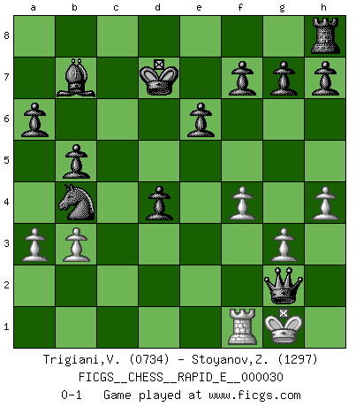 Last move : 0-1 2010 September 25 18:56:6 [Event "FICGS__CHESS__RAPID_E__000030"] [Site "FICGS"] [Date "2010.07.01"] [Round "1"] [White "Trigiani,Vincenzo"] [Black "Stoyanov,Zdravko"] [Result "0-1"] [WhiteElo "0734"] [BlackElo "1297"] 1.d4 d5 2.Bf4 Nc6 3.Nc3 e6 4.Nb5 a6 5.Nxc7+ Kd7 6.Nxa8 Bd6 7.e3 Bxf4 8.exf4 b5 9.Nf3 Bb7 10.Bd3 Qxa8 11.O-O Nf6 12.Qe1 Qb8 13.c3 Qxf4 14.g3 Qxf3 15.Be2 Qf5 16.Qd2 Qh3 17.Rfe1 Ne4 18.f3 Nxd2 19.Rad1 Nc4 20.Bf1 Qh5 21.Be2 Ne3 22.Rd3 Nc4 23.b3 Nd6 24.f4 Qf5 25.Re3 Ne4 26.Bf3 Nd2 27.R3e2 Nxf3+ 28.Kg2 Nxe1+ 29.Rxe1 Qc2+ 30.Kg1 Qxc3 31.Rf1 Qxd4+ 32.Kh1 Nb4 33.h4 Qe3 34.a3 d4 35.Kh2 Qe2+ 36.Kg1 Qg2+ 0-1 Queen's pawn, Mason variation Kingside Castling by player White (move 11) Player Black won this chess game. Follow this game move after move (download)Not only will I predict his triumph over Botvinnik, but I'll go further and say that he'll probably be the greatest Chess player that ever lived. (John Collins) Der beste Spieler in einem Turnier gewinnt es nie. Er landet auf Platz zwei oder drei. (Siegbert Tarrasch) Buenas posiciones no logran ganar juegos, buenas movidas sí. (Gerald Abrahams) Vous m'avez demandé de vous exposer quel est le fondement de la prière. Je ne fais que préparer les pièces du jeu sur la table... Nous sera-t-il permis d'en adopter les règles et si nous les appliquons scrupuleusement nous ne tarderons pas à faire mat le Roi divin ! Il ne pourra échapper à nos mains. (Sainte Thérèse d'Avila, Chemin de perfection) Begin at the beginning and go on till you come to the end; then stop. (Lewis Carrol, Alice in Wonderland)