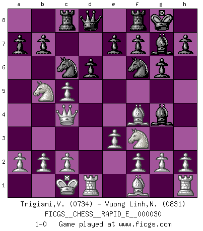 Last move : 1-0 2010 September 12 8:40:49 [Event "FICGS__CHESS__RAPID_E__000030"] [Site "FICGS"] [Date "2010.07.01"] [Round "1"] [White "Trigiani,Vincenzo"] [Black "Vuong Linh,Nguyen"] [Result "1-0"] [WhiteElo "0734"] [BlackElo "0831"] 1.d4 Nf6 2.Bf4 g6 3.Nc3 d6 4.e3 c5 5.dxc5 Nc6 6.Nf3 Bg4 7.Qe2 Bg7 8.O-O-O O-O 9.Qc4 Rc8 10.Nb5 1-0 This chess game has been lost on time (started : 2010.07.01 15:12:15) Queen's pawn game Queenside Castling by player White (move 8) Kingside Castling by player Black (move 8) Player White won this chess game. Follow this game move after move (download)When I have White, I win because I am white; When I have Black, I win because I am Bogolyubov. (Bogolyubov) Schach ist Krieg, im Schach geht es um testosterongesteuerte Urschreie. (Garry Kasparov) Yo he agregado estos principios a la ley: pongan los Caballos en acción antes de que los dos Alfiles sean desarrollados. (Emanuel Lasker) RxDa4 pat (...) There are two types of people in this world, good and bad. The good sleep better, but the bad seem to enjoy the waking hours much more. (Woody Allen)