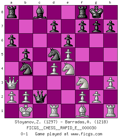Last move : 0-1 2010 July 8 20:16:48 [Event "FICGS__CHESS__RAPID_E__000030"] [Site "FICGS"] [Date "2010.07.01"] [Round "1"] [White "Stoyanov,Zdravko"] [Black "Barradas,Anderson"] [Result "0-1"] [WhiteElo "1297"] [BlackElo "1218"] 1.e4 c5 2.Nf3 e6 3.h3 a6 4.c3 Nc6 5.d4 cxd4 6.cxd4 Bb4+ 7.Bd2 b5 8.Qb3 Bxd2+ 9.Nbxd2 Nf6 10.e5 Nd5 11.Ne4 O-O 12.Qa3 Ncb4 13.O-O-O Qc7+ 14.Kb1 Qc2+ 0-1 Sicilian defense Kingside Castling by player Black (move 11) Queenside Castling by player White (move 13) Player Black won this chess game. Follow this game move after move (download)The Chess pieces are the block alphabet which shapes thoughts; and these thoughts, although making a visual design on the chessboard, express their beauty abstractly, like a poem. (Marcel Duchamp) Er war ein guter Schachspieler, aber ich kann Leute nicht ausstehen, die 'Heil Hitler' rufen (Über Alexander Aljechin). (Miguel Najdorf) El Ajedrez es 99 por ciento táctica. (Teichmann) La guerre est enfant de la passion, la passion est enfant du narcissisme et le narcissisme est l'enfant. (...) Une autre partie ? (Thibault de Vassal) A good player is always lucky. (Capablanca)