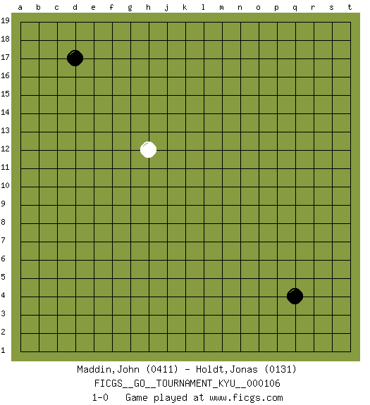 Last move : 1-0 2010 August 3 22:2:27 [Event "FICGS__GO__TOURNAMENT_KYU__000106"] [Site "FICGS"] [Date "2010.07.01"] [Round "1"] [Black "Maddin,John"] [White "Holdt,Jonas"] [Result "1-0"] [Rating 1 "0411"] [Rating 2 "0131"] 1.q4 h12 2.d17 1-0 This go game has been lost on time (started : 2010.07.01 18:10:21) Here are the names of the openings (joseki) played in the four corners : Corner d16 : h12 d17 This joseki is unknown. A weak or weird move has probably been played in this corner. Player Black won this Go (weiqi, baduk) game. Follow this game move after move (download)Territory is a closed space where time no longer exists. The transformation around it slower alter it, and sometimes it cracks open like a rotten egg at the least shock. (Pierre Audouard) First of all, we have to go back to the classical time control. (Anatoly Karpov)