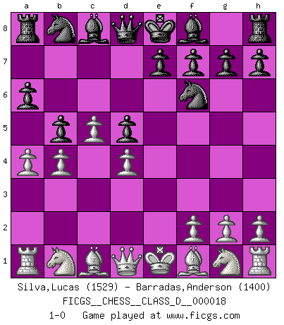 Last move : 1-0 2006 December 27 2:20:6 [Event "FICGS__CHESS__CLASS_D__000018"] [Site "FICGS"] [Date "2006.11.08"] [Round "1"] [White "Silva,Lucas"] [Black "Barradas,Anderson"] [Result "1-0"] [WhiteElo "1529"] [BlackElo "1400"] 1.e4 c6 2.d4 d5 3.exd5 cxd5 4.c4 Nf6 5.c5 a6 6.b4 b5 7.a4 1-0 This chess game has been lost on time (started : 2006.11.08 13:6:50) Caro-Kann : Panov-Botvinnik, Gunderam attack Player White won this chess game. Follow this game move after move (download)The mistakes are there, waiting to be made. (Savielly Tartakower) Frage des Reporters: -Welche besonderen Umstände rechtfertigen das Anhalten der Uhren während einer Turnierpartie? Antwort: -Einen Fotographen zu strangulieren. (Siegbert Tarrasch) Un jugador que es sorprendido, esta derrotado a medias. (Proverbio) Karpov est une pièce de musée. (Garry Kasparov) When the going gets tactical, the computers get going. (Hyatt)