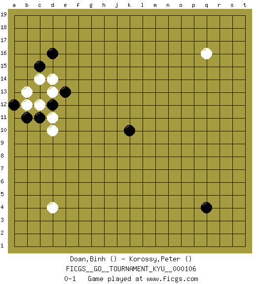 Last move : 0-1 2010 July 16 0:54:30 [Event "FICGS__GO__TOURNAMENT_KYU__000106"] [Site "FICGS"] [Date "2010.07.01"] [Round "1"] [Black "Doan,Binh"] [White "Korossy,Peter"] [Result "0-1"] 1.q4 d4 2.d16 q16 3.k10 c14 4.c15 d14 5.c13 d13 6.d12 d10 7.e13 c12 8.c11 b12 9.b11 d11 10.a12 b13 0-1 Here are the names of the openings (joseki) played in the four corners : Corner d16 : d16 c14 Hoshi (Hwajeom, Seongjeom, Xingwei`) 4-4 Point. The star or hoshi (4-4) point, emphasizing influence at the potential expense of territory. Ikken Kakari (Hankan Keolch'im, Yi Gua`jiao~, 1-Space Low Approach). White 2 is the standard approach move to the 4-4. Corner d4 : d4 0-1 Hoshi (Hwajeom, Seongjeom, Xingwei`) 4-4 Point. The star or hoshi (4-4) point, emphasizing influence at the potential expense of territory. Player White won this Go (weiqi, baduk) game. Follow this game move after move (download)Those who are good at winning, don't usually fight. (Zhang) The message for business people contemplating their place in the cyberspace is simple and direct: get linked or get lost. (Vic Sussman and Kenan Pollack)