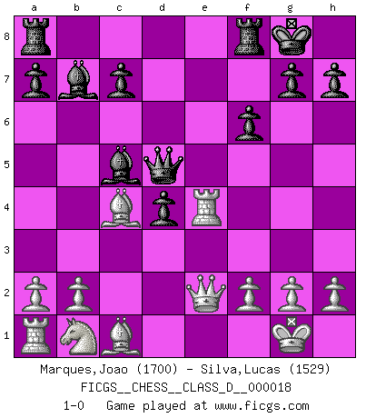 Last move : 1-0 2006 November 20 21:26:7 [Event "FICGS__CHESS__CLASS_D__000018"] [Site "FICGS"] [Date "2006.11.08"] [Round "1"] [White "Marques,Joao"] [Black "Silva,Lucas"] [Result "1-0"] [WhiteElo "1700"] [BlackElo "1529"] 1.e4 e5 2.Nf3 Nc6 3.Bc4 Nf6 4.O-O Nxe4 5.Re1 d5 6.Bb5 f6 7.d4 Bd6 8.c4 O-O 9.cxd5 Nxd4 10.Nxd4 exd4 11.Rxe4 Bc5 12.Bc4 b5 13.Bxb5 Qxd5 14.Qe2 Bb7 15.Bc4 1-0 Two knights defense Kingside Castling by player White (move 4) Kingside Castling by player Black (move 8) Player White won this chess game. Follow this game move after move (download)Chess is a foolish expedient for making idle people believe they are doing something very clever when they are only wasting their time. (George Bernard Shaw) Du musst Deinen Gegner in einen tiefen dunklen Wald führen wo 2+2=5 ist und wo der Weg, der wieder hinausführt, nur breit genug für einen ist. (Mikhail Nekhemyevich Tal) a manera como él juega al Ajedrez, demuestra la completa naturaleza de un hombre. (Stanley Ellin) Le pion, dans sa simplicité, marche droit devant lui, mais lorsqu'il prend, il le fait obliquement? Ainsi l'homme, tant qu'il reste pauvre, marche dans la droiture et vit honnêtement, mais lorsqu'il recherche les honneurs, il flatte, se parjure et, par les voies obliques, cherche une position supérieure sur l'échiquier du monde. (Jean de Galles) Information on the Internet is subject to the same rules and regulations as conversation at a bar. (George Lundberg)