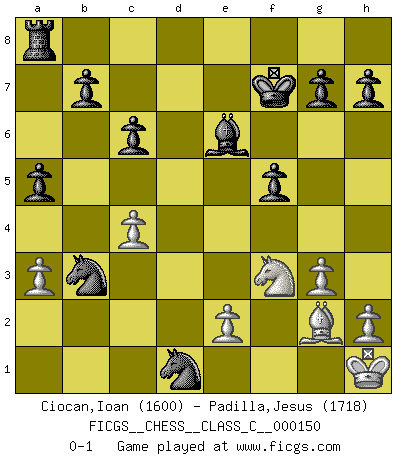 Last move : 0-1 2010 July 31 16:29:55 [Event "FICGS__CHESS__CLASS_C__000150"] [Site "FICGS"] [Date "2010.07.01"] [Round "1"] [White "Ciocan,Ioan"] [Black "Padilla,Jesus"] [Result "0-1"] [WhiteElo "1600"] [BlackElo "1718"] 1.d4 f5 2.c4 Nf6 3.g3 e6 4.Bg2 Bb4+ 5.Bd2 Bxd2+ 6.Nxd2 O-O 7.Ngf3 Nc6 8.O-O d6 9.Re1 e5 10.dxe5 dxe5 11.Nb3 Qe7 12.Qc2 a5 13.Nbd2 e4 14.Ng5 e3 15.fxe3 Qxe3+ 16.Kh1 Qxg5 17.Nf3 Qe3 18.Qd3 Ng4 19.Qxe3 Nxe3 20.Rac1 Rd8 21.Rc3 Nd1 22.Rc2 Nb4 23.Rd2 Rxd2 24.Nxd2 Nxb2 25.Rb1 Na4 26.a3 Nc6 27.Bd5+ Kf8 28.Rb3 Nd4 29.Re3 c6 30.Bg2 Be6 31.Re5 Kf7 32.Re3 Nb2 33.Nf3 Nd1 34.Rb3 Nxb3 0-1 Dutch defense : Dutch-Indian (Nimzo-Dutch) variation Kingside Castling by player Black (move 6) Kingside Castling by player White (move 8) Player Black won this chess game. Follow this game move after move (download)Fischer sacrificed virtually everything most of us weakies (to use his term) value, respect, and cherish, for the sake of an artful, often beautiful board game, for the ambivalent privilege of being its greatest master. (Paul Kollar) Ich las kürzlich ein Buch von Nietzsche. Er sagte Religion verdumme nur die Menschen. Ich stimme zu. (Robert James Fischer) El Ajedrez es la vida. (Bobby Fischer) Tous ces prétendus hommes politiques sont les pions, les Cavaliers, les Tours ou les Fous d'une partie d'échecs qui se jouera tant qu'un hasard ne renversera pas l'échiquier. (Honoré de Balzac) Two beer, or not two beer. (Unknown)