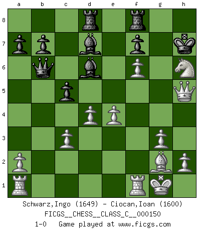 Last move : 1-0 2010 August 17 12:43:6 [Event "FICGS__CHESS__CLASS_C__000150"] [Site "FICGS"] [Date "2010.07.01"] [Round "1"] [White "Schwarz,Ingo"] [Black "Ciocan,Ioan"] [Result "1-0"] [WhiteElo "1649"] [BlackElo "1600"] 1.g3 e5 2.Bg2 d5 3.f3 Nc6 4.Nh3 Nf6 5.Nf2 Bd6 6.O-O O-O 7.d3 h6 8.e4 d4 9.Nd2 Be6 10.Nc4 Be7 11.f4 Ng4 12.Nxg4 Qd7 13.Ncxe5 Nxe5 14.Nxe5 Qd6 15.c3 dxc3 16.bxc3 Rad8 17.d4 c5 18.f5 Bd7 19.Bf4 Qf6 20.Ng4 Qb6 21.Bxh6 gxh6 22.f6 Bd6 23.Nxh6+ Kh7 24.Qh5 1-0 Benko's Opening Kingside Castling by player White (move 6) Kingside Castling by player Black (move 6) Player White won this chess game. Follow this game move after move (download)You know, comrade Pachman, I don't enjoy being a Minister, I would rather play Chess like you. (Che Guevara) Es tut gut, die Entwicklungsperiode von, [...] demokratischem Geist durchdringen zu lassen. Wie undemokratisch wäre es doch beispielsweise, den einen Offizier große Spaziertouren vornehmen zu lassen, während die anderen zu Hause säßen und sich entsetzlich langweilten. (Aaron Nimzowitsch) Aún el Rey más flojo huye despavorido ante la amenaza de un Jaque doble. (Aaron Nimzowitsch) Il s'avisa de me proposer d'apprendre les échecs qu'il jouait un peu... me voilà forcené des échecs. J'achète un échiquier, je m'enferme dans ma chambre, j'y passe des jours et des nuits à vouloir apprendre par cur toutes les parties. (Jean-Jacques Rousseau, Confessions) It's only after you lost everything, Tyler says, that you're free to do anything. (Chuck Palahniuk, Fight Club)