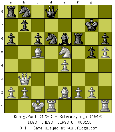 Last move : 0-1 2010 September 13 17:5:36 [Event "FICGS__CHESS__CLASS_C__000150"] [Site "FICGS"] [Date "2010.07.01"] [Round "1"] [White "Konig,Paul"] [Black "Schwarz,Ingo"] [Result "0-1"] [WhiteElo "1730"] [BlackElo "1649"] 1.c4 g6 2.Nc3 Bg7 3.Nf3 f6 4.e4 Nh6 5.d4 Nf7 6.Be2 O-O 7.h4 d6 8.h5 g5 9.Be3 h6 10.Qb3 c6 11.O-O-O Qc7 12.Qc2 a6 13.c5 e5 14.cxd6 Nxd6 15.Nd5 Qd8 16.Nxf6+ Bxf6 17.dxe5 Bxe5 18.Qb3+ Kg7 19.Nxe5 Rf6 20.Bc5 Be6 0-1 English Opening Kingside Castling by player Black (move 6) Queenside Castling by player White (move 11) Player Black won this chess game. Follow this game move after move (download)Chess is a terrific way for kids to build self image and self esteem. (Saudin Robovic) Ohne Leiden bildet sich kein Charakter. (Ernst Freiherr von Feuchtersleben) Nunca antes ha habido un jugador de Ajedrez con tal conocimiento a fondo de las complejidades del juego y una inmensa voluntad absolutamente indomable de ganar. Yo pienso que Fischer es el jugador mas grande que jamás haya existido. (Lisa Lane) Des points faibles ou des trous dans la position de l'adversaire doivent être occupés par des pièces et non pas par des pions. (Siegbert Tarrasch) The leaves of memory seemed to make a mournful rustling in the dark. (Henry Wadsworth Longfellow)