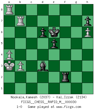 Last move : 1-0 2010 December 12 23:24:3 [Event "FICGS__CHESS__RAPID_M__000030"] [Site "FICGS"] [Date "2010.07.01"] [Round "1"] [White "Nookala,Kamesh"] [Black "Kal,Izzak"] [Result "1-0"] [WhiteElo "2037"] [BlackElo "2134"] 1.e4 c5 2.Nf3 d6 3.d4 cxd4 4.Nxd4 Nf6 5.Nc3 a6 6.h3 e5 7.Nde2 Nc6 8.g4 Be7 9.Be3 O-O 10.g5 Ne8 11.Qd2 f5 12.Nd5 fxe4 13.Bg2 Nc7 14.Bxe4 Nxd5 15.Bxd5+ Kh8 16.O-O-O Bd7 17.h4 Rc8 18.h5 Qa5 19.Nc3 Nb4 20.Bb3 Bf5 21.a3 Nxc2 22.Bxc2 Rxc3 23.Qxc3 Rc8 24.Qxa5 Rxc2+ 25.Kb1 Rc5 26.Ka1 Rxa5 27.Rc1 Kg8 28.h6 gxh6 29.gxh6 Kf7 30.Rhg1 Ke6 31.Rc7 Rb5 32.Rg8 Bh4 33.Re8+ Kd5 34.Ka2 a5 35.b3 Bg6 36.Ra8 Ke6 37.Rg7 Bd3 38.a4 Rb4 39.Rxa5 Re4 40.Ra8 Bxf2 41.Bxf2 Re2+ 42.Ka3 Rxf2 43.Rxb7 1-0 Sicilian : Najdorf, Adams attack Kingside Castling by player Black (move 9) Queenside Castling by player White (move 16) Player White won this chess game. Follow this game move after move (download)Chess is so inspiring that I do not believe a good player is capable of having an evil thought during the game. (Wilhelm Steinitz) Matt entspricht nicht immer den Tatsachen. (Savielly Grigorievitsch Tartakower) La maestría del Ajedrez consiste esencialmente en analizar posiciónes de Ajedrez con precisión. (Mikhail Botvinnik) Botvinnik disait en comparant les échecs à la musique: Il existe une science dont le but est l'étude de l'acoustique et des sons. Mais il y a aussi un art qui se sert de l'océan des sons : c'est la musique. De toute évidence, il en est de même pour la pensée. La logique est l'étude des lois de la réflexion et les échecs reflètent, en tant qu'art, le côté logique de la réflexion, sous la forme d'images artistiques... Extrait de Fischer - Spassky, Reykjavik 1972 par Alexander & F. Wyndham (Ed. Solar), p 37. All maxims have their antagonist maxims; proverbs should be sold in pairs, a single one being but a half truth. (William Mathews)