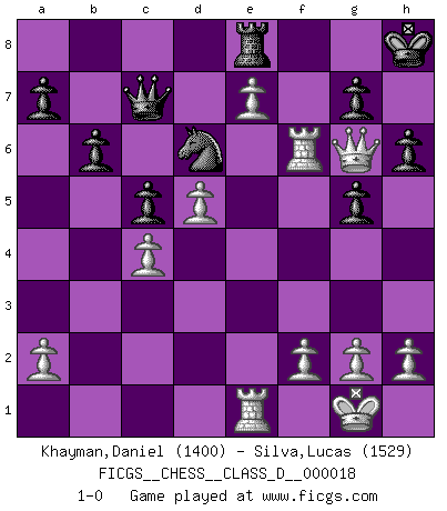 Last move : 1-0 2007 February 6 23:19:14 [Event "FICGS__CHESS__CLASS_D__000018"] [Site "FICGS"] [Date "2006.11.08"] [Round "1"] [White "Khayman,Daniel"] [Black "Silva,Lucas"] [Result "1-0"] [WhiteElo "1400"] [BlackElo "1529"] 1.b4 e5 2.Bb2 Bxb4 3.Bxe5 Nf6 4.Nf3 d6 5.Bc3 Bxc3 6.Nxc3 O-O 7.e3 Bf5 8.Rb1 b6 9.d4 Nbd7 10.Bd3 Bg6 11.Bxg6 fxg6 12.O-O c5 13.e4 Re8 14.Re1 Qc7 15.d5 Ne5 16.Ng5 Ned7 17.Ne6 Qb7 18.Nb5 Qb8 19.Nbc7 Rxe6 20.Nxe6 Nf8 21.Nxc5 dxc5 22.e5 Ne8 23.c4 g5 24.e6 Nd6 25.Qg4 h6 26.e7 Nh7 27.Qe6+ Kh8 28.Qg6 Nf6 29.Re6 Qc7 30.Rbe1 Re8 31.Rxf6 1-0 Polish (Sokolsky) opening Kingside Castling by player Black (move 6) Kingside Castling by player White (move 12) Player White won this chess game. Follow this game move after move (download)Nowadays, when you're not a grandmaster at 14, you can forget about it. (Anand Viswanathan) Man kann eine Schachpartie nur gewinnen, wenn das Gleichgewicht gestört ist. In einer Stellung mit ungestörtem Gleichgewicht ist auch das größte Genie hilflos - in der Stellung steckt dann eben kein genialer Einfall. (Wilhelm Steinitz) La batalla por la última verdad nunca sera ganada. Y es por eso que el Ajedrez es tan fascinante. (Hans Kmoch) Les Cavaliers se révèlent fort utiles dans les positions fermées. D'habitude, les Fous sont un peu plus forts que les Cavaliers dans les positions ouvertes. Qu'on le veuille ou non, il restera toujours des exceptions ! Luck never made a man wise. (Seneca, Letters to Lucilius)