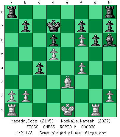 Last move : 1/2-1/2 2010 October 28 20:31:27 [Event "FICGS__CHESS__RAPID_M__000030"] [Site "FICGS"] [Date "2010.07.01"] [Round "1"] [White "Maceda,Coco"] [Black "Nookala,Kamesh"] [Result "1/2-1/2"] [WhiteElo "2105"] [BlackElo "2037"] 1.e4 c5 2.Nf3 d6 3.c3 Nf6 4.Bc4 Nc6 5.d4 cxd4 6.cxd4 Nxe4 7.d5 Ne5 8.Nxe5 dxe5 9.Qe2 Nd6 10.Bd3 Qc7 11.Nc3 Bf5 12.f4 e4 13.Nb5 Qc5 14.Nxd6+ exd6 15.Bb5+ Ke7 16.g4 a6 17.gxf5 axb5 18.Qxe4+ Kd7 19.Be3 Qc4 20.Qxc4 bxc4 21.Rg1 g6 22.f6 Bh6 1/2-1/2 Sicilian This chess game ended in a draw. Follow this game move after move (download)Good positions don't win games, good moves do. (Gerald Abrahams) Ein guter Spieler hat immer Glück. (José Raúl Capablanca) Cuando tu no sabes absolutamente que mas hacer, es tiempo de entrar en pánico. (John van der Wiel) Je crois qu'il existe des manières très spécifiques de jouer efficacement contre une machine. Evidemment, nous n'avons aucune chance en technique pure, parce que l'ordinateur calcule de manière parfaite. Mais lorsque nous faisons appel à notre cerveau, en utilisant l'intuition et la compréhension, alors nous restons beaucoup plus forts. (Anatoli Karpov) 98% of all statistics are made up. (Author unknown)