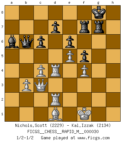Last move : 1/2-1/2 2010 August 22 16:29:25 [Event "FICGS__CHESS__RAPID_M__000030"] [Site "FICGS"] [Date "2010.07.01"] [Round "1"] [White "Nichols,Scott"] [Black "Kal,Izzak"] [Result "1/2-1/2"] [WhiteElo "2229"] [BlackElo "2134"] 1.e4 c5 2.Nc3 Nc6 3.Nf3 e6 4.d4 cxd4 5.Nxd4 Qc7 6.Be3 a6 7.Be2 Nf6 8.O-O Bb4 9.Na4 O-O 10.Nxc6 bxc6 11.f4 Be7 12.e5 Nd5 13.Bd2 Qa7+ 14.Kh1 Ne3 15.Bxe3 Qxe3 16.c4 Rd8 17.Rf3 Qa7 18.Rd3 Rb8 19.Qd2 a5 20.Nc3 f6 21.Ne4 Bb4 22.Qc2 f5 23.Nd6 a4 24.Rad1 Qf2 25.Rf1 Qa7 26.Bh5 g6 27.Be2 Qa5 28.h4 Ba6 29.h5 Rf8 30.hxg6 hxg6 31.Rfd1 Bxd6 32.Rxd6 Bc8 33.R6d4 Qc5 34.R1d2 g5 35.g3 gxf4 36.gxf4 Rf7 37.Bf3 Rh7+ 38.Kg1 Rg7+ 39.Kf1 Ba6 40.b3 axb3 41.axb3 Qb6 42.Bd1 Rf8 43.Qb2 R8f7 44.Qc3 1/2-1/2 Sicilian : Closed, 2...Nc6 Kingside Castling by player White (move 8) Kingside Castling by player Black (move 9) This chess game ended in a draw. Follow this game move after move (download)Chess is imagination. (David Bronstein) Ich möchte Schüler heranbilden, die das Vermögen haben, selbst zu denken und Kritik zu üben. (Emanuel Lasker) El Rey es una pieza de pelea. ¡Usenlo!. (Wilhelm Steinitz) Roi des jeux et jeu des rois, les échecs portent en eux un sentiment d'infini. Ils donnent à celui qui s'est efforcé d'en approfondir les arcanes l'impression de n'être pas à la mesure de l'homme; en fait, ils constituent un résumé de l'univers, un microcosme, et figurent cette grande échelle qui, dans les plans de la lumière descend jusqu'à la matière, qui des abîmes insondables remonte jusqu'en l'infini de Dieu. (Pyrame) There are two kinds of people in the world, my friend. Those who have a loaded gun and those who dig. You dig ! (Blondie in The Good, The Bad and The Ugly)