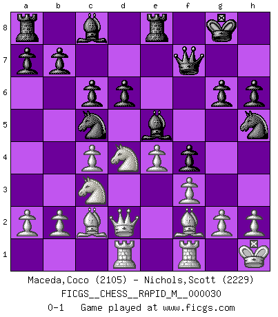 Last move : 0-1 2010 August 22 10:43:56 [Event "FICGS__CHESS__RAPID_M__000030"] [Site "FICGS"] [Date "2010.07.01"] [Round "1"] [White "Maceda,Coco"] [Black "Nichols,Scott"] [Result "0-1"] [WhiteElo "2105"] [BlackElo "2229"] 1.d4 Nf6 2.c4 g6 3.Nc3 Bg7 4.Nf3 O-O 5.e4 d6 6.Be2 e5 7.O-O exd4 8.Nxd4 Re8 9.f3 c6 10.Kh1 Qe7 11.Bg5 h6 12.Bf4 Nh5 13.Be3 f5 14.Qd2 f4 15.Bf2 Be5 16.Rad1 Na6 17.Bd3 Nc5 18.Bc2 Qf7 0-1 This chess game has been lost on time (started : 2010.07.01 22:59:21) King's Indian defense, 3.Nc3 Kingside Castling by player Black (move 4) Kingside Castling by player White (move 7) Player Black won this chess game. Follow this game move after move (download)Your body has to be in top condition. Your Chess deteriorates as your body does. You can't separate body from mind. (Bobby Fischer) Ich las kürzlich ein Buch von Nietzsche. Er sagte Religion verdumme nur die Menschen. Ich stimme zu. (Robert James Fischer) Algunos sacrificios son sólidos, los demás son míos. (Mikhail Tal) Toutes choses étant égales, c'est la conviction qui gagne. Alliée à une volonté de vaincre, elle sert de détonateur, suscite des idées, disperse les doutes et aide à penser clairement. (Robert Fischer) Heh, heh, heh. Time to abandon ship. (General Grievous in Star Wars ep.3)
