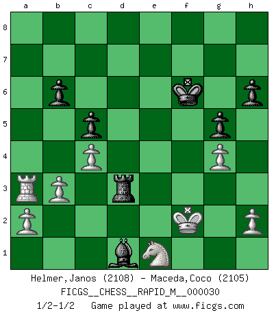 Last move : 1/2-1/2 2010 November 20 18:44:29 [Event "FICGS__CHESS__RAPID_M__000030"] [Site "FICGS"] [Date "2010.07.01"] [Round "1"] [White "Helmer,Janos"] [Black "Maceda,Coco"] [Result "1/2-1/2"] [WhiteElo "2108"] [BlackElo "2105"] 1.Nf3 Nf6 2.g3 c5 3.c4 g6 4.b3 Bg7 5.Bb2 O-O 6.Bg2 Nc6 7.O-O Qa5 8.Nc3 d5 9.cxd5 Nxd5 10.Qc1 Nxc3 11.Bxc3 Bxc3 12.dxc3 Bf5 13.Qe3 Rad8 14.Ng5 Rd6 15.Bxc6 Rxc6 16.Qxe7 Rc7 17.Qe3 Rd7 18.Rfe1 Rfd8 19.Qf4 h6 20.Nf3 Kg7 21.e4 Be6 22.Qe5+ Kh7 23.Qf6 Rd3 24.c4 Qc3 25.Qxc3 Rxc3 26.Kg2 g5 27.Ng1 Kg7 28.Re2 a5 29.Rb2 Rcd3 30.Re1 a4 31.f3 b6 32.Kf2 a3 33.Rc2 f5 34.exf5 Bxf5 35.g4 Rxf3+ 36.Nxf3 Bxc2 37.Re7+ Kf6 38.Ra7 Bd1 39.Rxa3 Rd3 40.Ne1 1/2-1/2 Reti Opening Kingside Castling by player Black (move 5) Kingside Castling by player White (move 7) This chess game ended in a draw. Follow this game move after move (download)The game of Chess is not merely an idle amusement; several very valuable qualities of the mind are to be acquired and strengthened by it, so as to become habits ready on all occasions; for life is a kind of Chess. (Benjamin Franklin) Ich habe Kasparov in Rente geschickt. (Veselin Topalov) Todo se encuentra en un estado de flujo y esto incluye al mundo del Ajedrez. (Mikhail Botvinnik) Il (Jacob Murray) ne joue pas pour le bon coup, mais pour le meilleur. (Eloi Relange) Life doesn't imitate art, it imitates bad television. (Woody Allen)