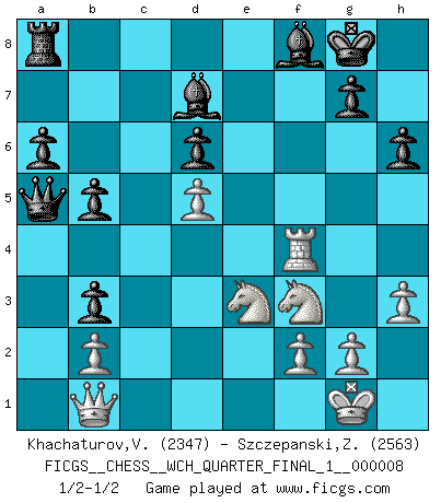 Last move : 1/2-1/2 2010 August 11 2:24:56 [Event "FICGS__CHESS__WCH_QUARTER_FINAL_1__000008"] [Site "FICGS"] [Date "2010.07.02"] [Round "6"] [White "Khachaturov,Vadim"] [Black "Szczepanski,Zbigniew"] [Result "1/2-1/2"] [WhiteElo "2347"] [BlackElo "2563"] 1.e4 e5 2.Nf3 Nc6 3.Bb5 a6 4.Ba4 Nf6 5.O-O Be7 6.Re1 b5 7.Bb3 O-O 8.c3 d6 9.h3 Bb7 10.d4 Re8 11.Nbd2 Bf8 12.a4 h6 13.Bc2 exd4 14.cxd4 Nb4 15.Bb1 c5 16.d5 Nd7 17.Ra3 Nb6 18.a5 Nd7 19.Nf1 f5 20.Bd2 fxe4 21.Bxb4 cxb4 22.Rae3 Nf6 23.Bxe4 Rxe4 24.Rxe4 Nxe4 25.Rxe4 Qxa5 26.Ne3 Bc8 27.Qb1 b3 28.Rf4 Bd7 1/2-1/2 Ruy Lopez : Closed, 7...O-O Kingside Castling by player White (move 5) Kingside Castling by player Black (move 7) This chess game ended in a draw. Follow this game move after move (download)I had a toothache during the first game. In the second game I had a headache. In the third game it was an attack of rheumatism. In the fourth game, I wasn't feeling well. And in the fifth game? Well, must one have to win every game ? (Siegbert Tarrasch) Wenn Du absolut nicht mehr weißt, was Du tun sollst, dann ist es Zeit für Panik. (John van der Wiel) La enorme capacidad mental, en la que sin ella no puede un jugador de Ajedrez existir, es demasiado requerida por el Ajedrez al grado de que nunca podrá liberar su mente de este juego. (Albert Einstein) C'est une question de caractère, Beaucoup de gens perdent leur motivation très vite. D'autres, ils sont rares, peuvent la conserver très longtemps. J'aime les échecs, encore aujourd'hui je suis heureux d'analyser des parties. J'aime toujours gagner, je déteste encore perdre. Bien jouer est important pour mon intégrité intellectuelle et morale. Et puis les échecs vivent en ce moment une période historique grâce à Internet. Ils se développent dans les systèmes éducatifs à travers le monde. Ils sortent de leur ghetto, et c'est mon rôle de mener à bien cette révolution. (Gary Kasparov) The real voyage of discovery consists not in seeking new lands but in seeing with new eyes. (Marcel Proust)