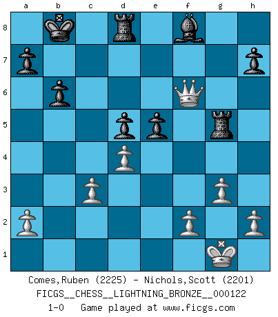 Last move : 1-0 2010 July 2 0:51:33 [Event "FICGS__CHESS__LIGHTNING_BRONZE__000122"] [Site "FICGS"] [Date "2010.07.02"] [Round "1"] [White "Comes,Ruben"] [Black "Nichols,Scott"] [Result "1-0"] [WhiteElo "2225"] [BlackElo "2201"] 1.e4 e5 2.Nf3 Nf6 3.d4 Nxe4 4.Bd3 d5 5.Nxe5 Nd7 6.Nxd7 Bxd7 7.O-O Qh4 8.c4 O-O-O 9.c5 g5 10.Nc3 Rg8 11.g3 Nxc3 12.bxc3 Qh3 13.Re1 Kb8 14.Rb1 Bc8 15.Qa4 Ka8 16.Re5 f6 17.c6 b6 18.Rxb6 cxb6 19.Bf5 Kb8 20.Bxh3 fxe5 21.c7+ Kxc7 22.Bxc8 Kxc8 23.Bxg5 Rxg5 24.Qc6+ Kb8 25.Qf6 1-0 Petrov : Modern attack, Symmetrical variation Kingside Castling by player White (move 7) Queenside Castling by player Black (move 8) Player White won this chess game. Follow this game move after move (download)Let the perfectionist play postal. (Yasser Seirawan) Man wirke der falschen Auffassung entgegen, als ob jeder Zug Unmittelbares zu leisten habe; auch Werte- und Ruhezüge haben ihre Existenzberechtigung. (Aaron Nimzowitsch) Hay dos clases de hombres: aquellos que se conforman en dejarse llevar por las circunstancias y que juegan barajas y aquellos decididos a controlar las circunstancias y que juegan al Ajedrez. (Mortimer Collins) Une platitude souvent récitée à propos des Echecs est qu'une des choses les plus difficiles à réaliser est de gagner une position gagnante. Cela ne manque pas de sens mais, pour ma part, j'ai toujours trouvé plus difficile de gagner une position perdante. (Tim Krabbe) The only sure thing about luck is that it will change. (Wilson Mizner)