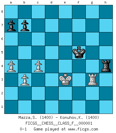 Last move : 0-1 2006 September 24 21:5:28 [Event "FICGS__CHESS__CLASS_F__000001"] [Site "FICGS"] [Date "2006.04.28"] [Round "1"] [White "Mazza,Stefano"] [Black "Konuhov,Konstantin"] [Result "0-1"] [WhiteElo "1400"] [BlackElo "1400"] 1.e4 c5 2.Nf3 Nc6 3.d4 cxd4 4.Nxd4 Qa5+ 5.Nc3 Nxd4 6.Qxd4 e5 7.Qd5 Bb4 8.Qxa5 Bxa5 9.Bd2 Nf6 10.O-O-O O-O 11.f3 Rb8 12.Nd5 Bxd2 13.Rxd2 Nxd5 14.Rxd5 d6 15.Rxd6 Be6 16.b3 Rfd8 17.Rxd8+ Rxd8 18.Bd3 h5 19.Rg1 h4 20.g3 hxg3 21.hxg3 f6 22.g4 Kf7 23.Kd2 Rh8 24.Ke3 Kg6 25.Rg3 Rh2 26.f4 exf4+ 27.Kxf4 Rf2+ 28.Ke3 Rh2 29.e5 Kg5 30.exf6 gxf6 31.Be2 Rh4 32.a4 f5 33.gxf5 Kxf5 34.Bd3+ Ke5 35.c4 Bf5 36.Bxf5 Kxf5 0-1 Sicilian defense Queenside Castling by player White (move 10) Kingside Castling by player Black (move 10) 10 pieces endgame at move 36 : White KRBPPP , Black KRPP WHITE : King + 1 Rook 1 Bishop 3 Pawns BLACK : King + 1 Rook 2 Pawns 9 pieces endgame at move 36 : White KRPPP , Black KRPP WHITE : King + 1 Rook 3 Pawns BLACK : King + 1 Rook 2 Pawns Player Black won this chess game. Follow this game move after move (download)Pawns: they are the soul of this game, they alone form the attack and defense. (Philidor) Immer nach dem besten Zug zu suchen ist ziemlich unpraktisch. (Nigel Short) El Ajedrez tiene tanto misterio como las mujeres. (Purdy) Le profane ne songe pas à la somme de jouissance dont il se prive, qui méconnaît ce jeu aux ressources aussi variées que passionnantes. (Jean-Marie Jeanton-Lamarche) First of all, we have to go back to the classical time control. (Anatoly Karpov)