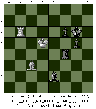 Last move : 0-1 2010 December 22 21:17:55 [Event "FICGS__CHESS__WCH_QUARTER_FINAL_4__000008"] [Site "FICGS"] [Date "2010.07.02"] [Round "6"] [White "Tomov,Georgi"] [Black "Lowrance,Wayne"] [Result "0-1"] [WhiteElo "2370"] [BlackElo "2537"] 1.d4 Nf6 2.c4 e6 3.g3 d5 4.Bg2 dxc4 5.Nf3 a6 6.Ne5 Bb4+ 7.Nc3 Nd5 8.Bd2 Nb6 9.e3 N8d7 10.Nxd7 Qxd7 11.Ne4 a5 12.Nc5 Bxc5 13.dxc5 Nd5 14.Qg4 O-O 15.Qxc4 b6 16.cxb6 Ba6 17.Qd4 c5 18.Qg4 Qb5 19.Bxd5 exd5 20.O-O-O Bc8 21.Qf4 Bb7 22.f3 d4 23.exd4 cxd4 24.Kb1 Qxb6 25.Be1 Rfd8 26.Bf2 Qg6+ 27.Ka1 d3 28.Rhe1 Rac8 29.Be3 Rc2 30.Bd4 h6 31.Bc3 Qc6 32.Qe5 f6 33.Qxa5 Qd7 34.Kb1 Bxf3 35.Rd2 Ra8 36.Qb6 Bd5 37.Rxc2 Bxa2+ 38.Kc1 dxc2 39.b3 Ra7 40.Qe6+ Qxe6 41.Rxe6 Bxb3 42.Rb6 Ba4 43.Rb4 Kf7 44.g4 g5 45.Be1 Ra8 46.h4 Bc6 47.Kxc2 Re8 48.Kd2 Bf3 49.Bg3 Re2+ 50.Kd3 Rg2 51.Be1 Bxg4 52.hxg5 hxg5 53.Rb7+ Kg6 54.Rb6 Rh2 55.Bc3 Be2+ 56.Ke4 Rh4+ 57.Kd5 Rf4 0-1 Catalan : Open, 5.Nf3 Kingside Castling by player Black (move 14) Queenside Castling by player White (move 20) 10 pieces endgame at move 51 : White KRBP , Black KRBPPP WHITE : King + 1 Rook 1 Bishop 1 Pawn BLACK : King + 1 Rook 1 Bishop 3 Pawns 9 pieces endgame at move 52 : White KRBP , Black KRBPP WHITE : King + 1 Rook 1 Bishop 1 Pawn BLACK : King + 1 Rook 1 Bishop 2 Pawns 8 pieces endgame at move 52 : White KRB , Black KRBPP WHITE : King + 1 Rook 1 Bishop BLACK : King + 1 Rook 1 Bishop 2 Pawns Player Black won this chess game. Follow this game move after move (download)There is only one thing Fischer does in Chess without pleasure: to lose ! (Boris Spassky) Zu meiner Zeit war ein 20 jähriger ein junger Spieler, heute ist er ein Veteran. (Garry Kasparov) En partidas rápidas, el Caballo es mas poderoso que el Alfil. (Vlastimil Hort) Le thème de l'attaque double intervient d'une manière ou d'une autre dans l'immense majorité des combinaisons. (Youri Averbakh) All maxims have their antagonist maxims; proverbs should be sold in pairs, a single one being but a half truth. (William Mathews)