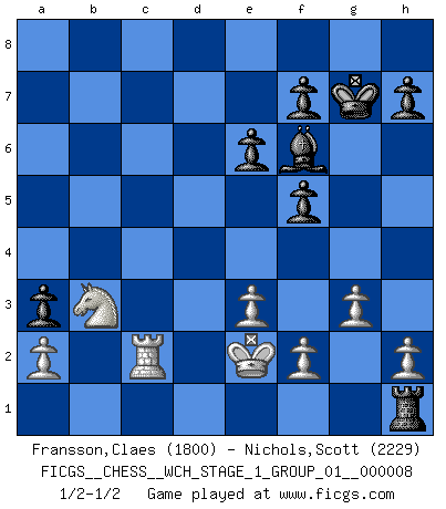 Last move : 1/2-1/2 2010 September 29 22:58:19 [Event "FICGS__CHESS__WCH_STAGE_1_GROUP_01__000008"] [Site "FICGS"] [Date "2010.08.13"] [Round "1"] [White "Fransson,Claes"] [Black "Nichols,Scott"] [Result "1/2-1/2"] [WhiteElo "1800"] [BlackElo "2229"] 1.d4 d5 2.Nf3 Nf6 3.c4 c6 4.e3 e6 5.Bd3 dxc4 6.Bxc4 c5 7.O-O a6 8.dxc5 Qxd1 9.Rxd1 Bxc5 10.Be2 O-O 11.Bd2 b6 12.Ne5 Bb7 13.Bc3 Nc6 14.Nd2 Nxe5 15.Bxe5 Rfc8 16.Rac1 b5 17.Bxf6 gxf6 18.Bf3 Bxf3 19.Nxf3 f5 20.Rd2 Be7 21.Rdc2 Rxc2 22.Rxc2 Rd8 23.Kf1 Rd1+ 24.Ke2 Ra1 25.b3 Bf6 26.g3 a5 27.Ne1 a4 28.Nd3 Kg7 29.bxa4 bxa4 30.Nc5 a3 31.Nb3 Rh1 1/2-1/2 Queen's pawn game Kingside Castling by player White (move 7) Kingside Castling by player Black (move 10) This chess game ended in a draw. Follow this game move after move (download)Modern Chess is too much concerned with things like Pawn structure. Forget it, Checkmate ends the game. (Nigel Short) Woher wissen wir, daß der Neanderthaler Blindschach gespielt hat? -- Bei Ausgrabungen wurden keine Schachbretter und Figuren gefunden. (Anonymous) Durante una competencia de Ajedrez, un Maestro de Ajedrez deberá ser una combinación de presa de caza y un Monge. (Alexander Alekhine) Le génie consiste à savoir transgresser les règles au moment opportun. (Teichmann) True nature is revealed in times of difficulty. (Chinese proverb)