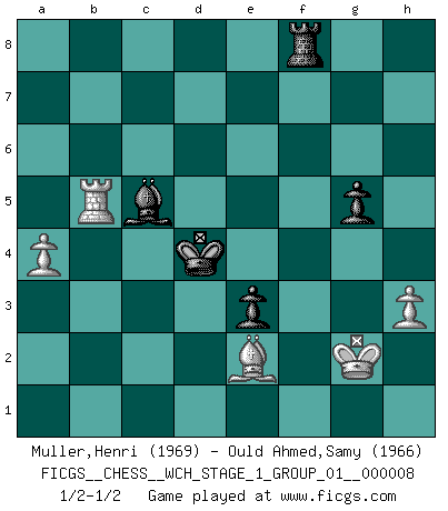 Last move : 1/2-1/2 2010 October 11 10:52:56 [Event "FICGS__CHESS__WCH_STAGE_1_GROUP_01__000008"] [Site "FICGS"] [Date "2010.07.02"] [Round "1"] [White "Muller,Henri"] [Black "Ould Ahmed,Samy"] [Result "1/2-1/2"] [WhiteElo "1969"] [BlackElo "1966"] 1.e4 c5 2.Nf3 d6 3.d4 cxd4 4.Nxd4 Nf6 5.Nc3 a6 6.Bg5 e6 7.f4 Qb6 8.Qd2 Qxb2 9.Rb1 Qa3 10.e5 h6 11.Bxf6 gxf6 12.exd6 Nd7 13.Be2 Qxd6 14.Ne4 Qc7 15.Bh5 Qc4 16.Qe3 Be7 17.f5 Nc5 18.fxe6 Bxe6 19.Nxc5 Qxc5 20.Bf3 Rd8 21.c3 O-O 22.O-O Qg5 23.Qxg5+ hxg5 24.Nxe6 fxe6 25.Rxb7 Bc5+ 26.Kh1 Rd2 27.Rc7 Bd6 28.Rc6 Kf7 29.Rd1 Rxd1+ 30.Bxd1 Ke7 31.Rxa6 f5 32.Ra7+ Kf6 33.Bb3 Rc8 34.Ra6 Ke5 35.Ra5+ Kf6 36.c4 Bb4 37.Rb5 Bc5 38.g3 e5 39.g4 e4 40.gxf5 Kxf5 41.Kg2 e3 42.Bd1 Ke4 43.a4 Kd4 44.Bf3 Rf8 45.h3 Kxc4 46.Be2+ Kd4 47.Bf3 Kc4 48.Be2+ Kd4 1/2-1/2 Sicilian : Najdorf, 7...Qb6 Kingside Castling by player Black (move 21) Kingside Castling by player White (move 22) 10 pieces endgame at move 45 : White KRBPP , Black KRBPP WHITE : King + 1 Rook 1 Bishop 2 Pawns BLACK : King + 1 Rook 1 Bishop 2 Pawns This chess game ended in a draw. Follow this game move after move (download)Could we look into the head of a Chess player, we should see there a whole world of feelings, images, ideas, emotion and passion. (Alfred Binet) Kombinieren und Schwarzhandel gehören verboten. (Savielly Grigorievitsch Tartakower) ¡Examina movidas que hagan daño! Un buen ojo for movidas desvastantes es mucho mas importante que el conocimiento de principios estratégicos. (Purdy) Si rien de grave n'est détecté lors de l'analyse d'une position, on joue alors le coup. Seconde règle de Blumenfeld. There are two kinds of people in the world, my friend. Those who have a loaded gun and those who dig. You dig ! (Blondie in The Good, The Bad and The Ugly)