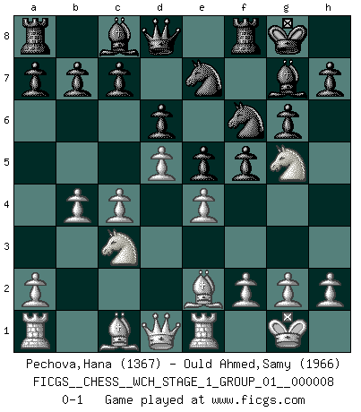 Last move : 0-1 2010 September 28 21:16:29 [Event "FICGS__CHESS__WCH_STAGE_1_GROUP_01__000008"] [Site "FICGS"] [Date "2010.07.02"] [Round "1"] [White "Pechova,Hana"] [Black "Ould Ahmed,Samy"] [Result "0-1"] [WhiteElo "1367"] [BlackElo "1966"] 1.d4 Nf6 2.c4 g6 3.Nc3 Bg7 4.e4 d6 5.Nf3 O-O 6.Be2 e5 7.O-O Nc6 8.d5 Ne7 9.b4 Nh5 10.Re1 f5 11.Ng5 Nf6 0-1 This chess game has been lost on time (started : 2010.07.02 0:20:4) King's Indian : Orthodox, Aronin-Taimanov variation (Yugoslav attack / Mar del Plata variation) Kingside Castling by player Black (move 5) Kingside Castling by player White (move 7) Player Black won this chess game. Follow this game move after move (download)If your opponent cannot do anything active, then don't rush the position; instead you should let him sit there, suffer, and beg you for a draw. (Jeremy Silman) Ich habe die besten Aussichten, den ersten Preis zu gewinnen - denn jeder muss gegen Steinitz spielen, nur ich nicht! (Wilhelm Steinitz) Debemos de asegurarnos de que el Ajedrez no se convierta en un lenguaje muerto, muy interesante, pero solo para un grupo muy pequeño. (Sytze Faber) Pour se monter efficace, un Cavalier a besoin d'avant-postes ! Les Cavaliers font les meilleurs bloqueurs de pions passés. Gambling : The sure way of getting nothing from something. (Wilson Mizner)